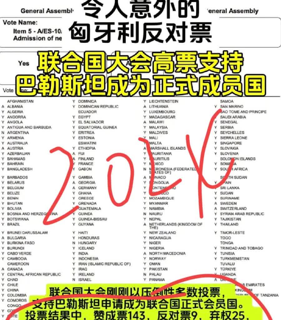 联大投票巴勒斯坦两国方案,10国反对票:阿根廷,匈牙利,帕劳,瑙鲁,巴布亚新几内