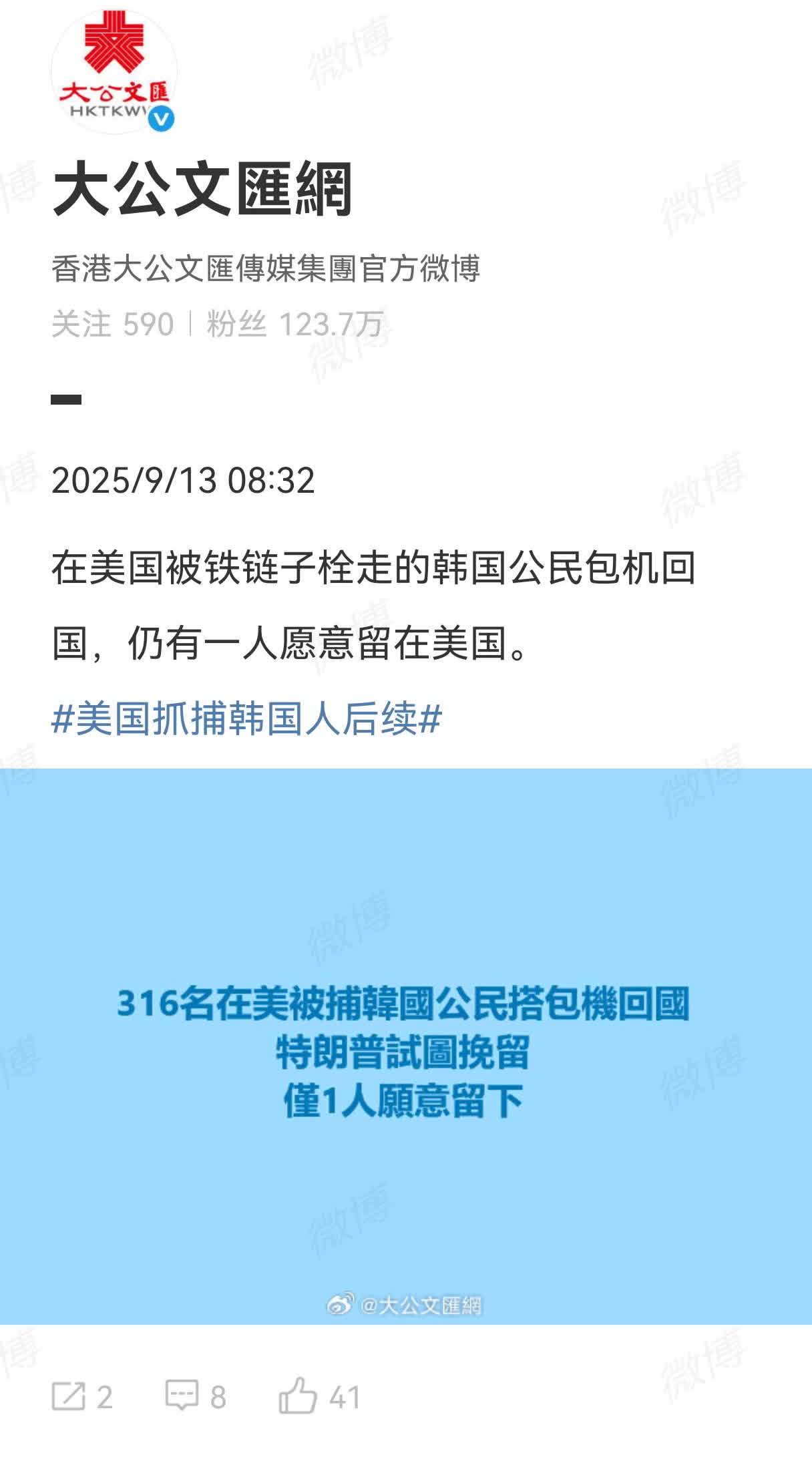 据香港大公文汇网报道:在美国被铁链子栓走的韩国公民包机回国,仍有一人愿意留在美国。317名韩国人以为签证原因2025年9月4日在美国佐治亚州萨瓦纳被捕。9月11日从拘留所到机场428公里,分乘8辆大巴运送,直到上了飞机,这一行人才定下心来,也直到上了飞机,在韩国的一再请求下才解开脚镣手铐。从9月12日已经抵达韩国。不知道留下来的那名韩国人是怎么想的,是不是想继续留在美国,追求美国梦。