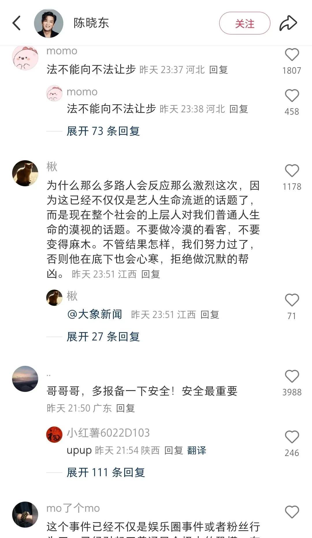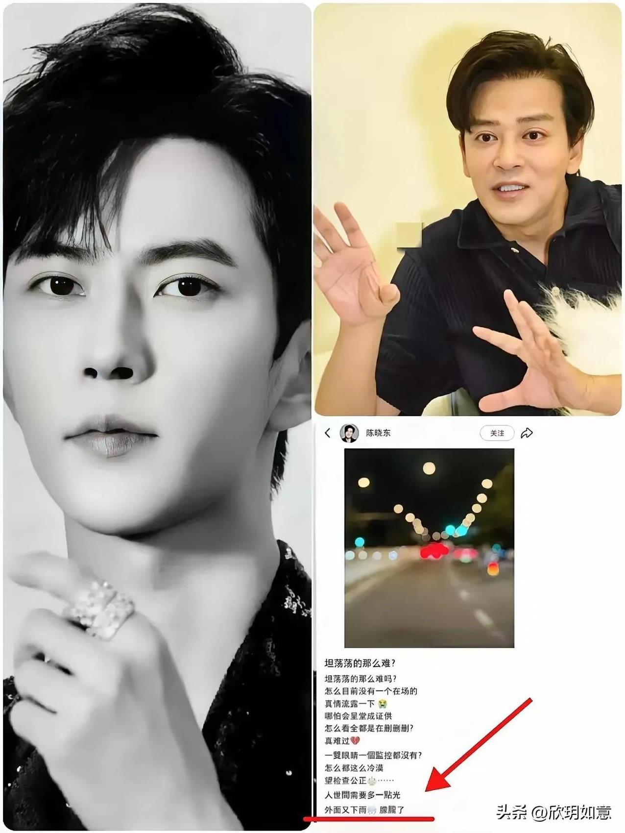陈晓东为于朦胧发声,太勇了!真的是字字句句铿锵有力,他说:“在这个圈子里,大家都很沉默,但我不想沉默了,我想发声,我想坦荡的做一个人。也许我没有办法做一个正义的人,但是我可以做一个不藏污纳垢的人。我跟于朦胧在《追光吧!哥哥》一起经历过很多事情,我知道他是一个很善良的人,我为他发声也是因为我喜欢他,我们应该为自己喜欢的人发声,不应该沉默。沉默带不来任何安全,正义才是迎接光明的方式。”他还反问:“一双眼睛一个监控都没有?怎么都那么冷漠?望检查公正,人世间需要多一点光”。 陈晓东此举引发网友热议,不沉默、不冷漠,因为就像陈晓东说的,“沉默带不了任何安全,正义才是迎接光明的方式”。 必须说,对陈晓东刮目相看!如果说,曾经被你的歌深深打动,现在被你的勇敢发声感动,这是一种了不起的人格力量![赞]