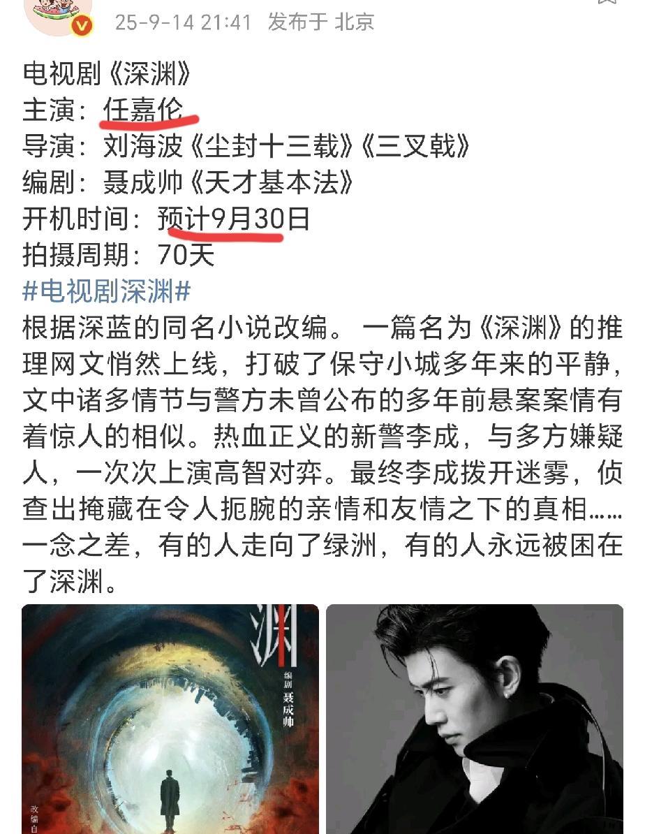 任嘉伦新剧《深渊》即将开机!! 这次国超要进入悬疑剧赛道了,预计70天拍完,速度还挺快。 按照这个节奏,到年底任嘉伦就会有四部待播剧了: 两部古偶《佳偶天成》《凤凰台上》 一部广电重点大剧《风与潮》 一部悬疑剧《深渊》 #任嘉伦# #任嘉伦演技#