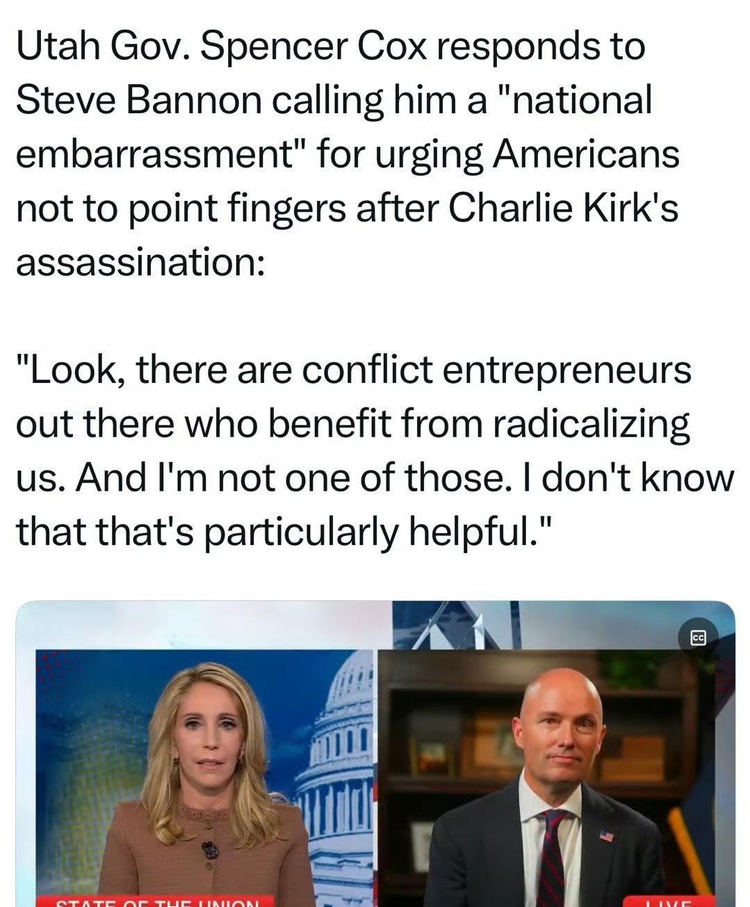 Bannon(班农)指责犹他州长让大家冷静,认为此时应大干一场。 Cox州长:有些人,是“冲突企业家”,专门挑唆、从中获利,我不会这样做,于事无补。 班农是右翼保守主义的代表,长期活跃在政治决斗场,获得了实实在在的好处,把马斯克挤走,此人就“功不可没”。这类人的生存依赖就是制造并利用冲突把事态搞大,即“冲突企业家”,从中渔利。 目前,美国柯克暗杀事件的外溢效应已经波及欧洲,已致欧洲议会因政治分歧连会议都开不下去。 查理·柯克创建的“美国转折点”(TPUSA)在他的遗孀埃里卡演讲之后,收到了1万8千份创办分会的申请。正如有的网友所言,毁了一个麦穗,长了一地麦子。 美国到了该踩刹车的时候了。