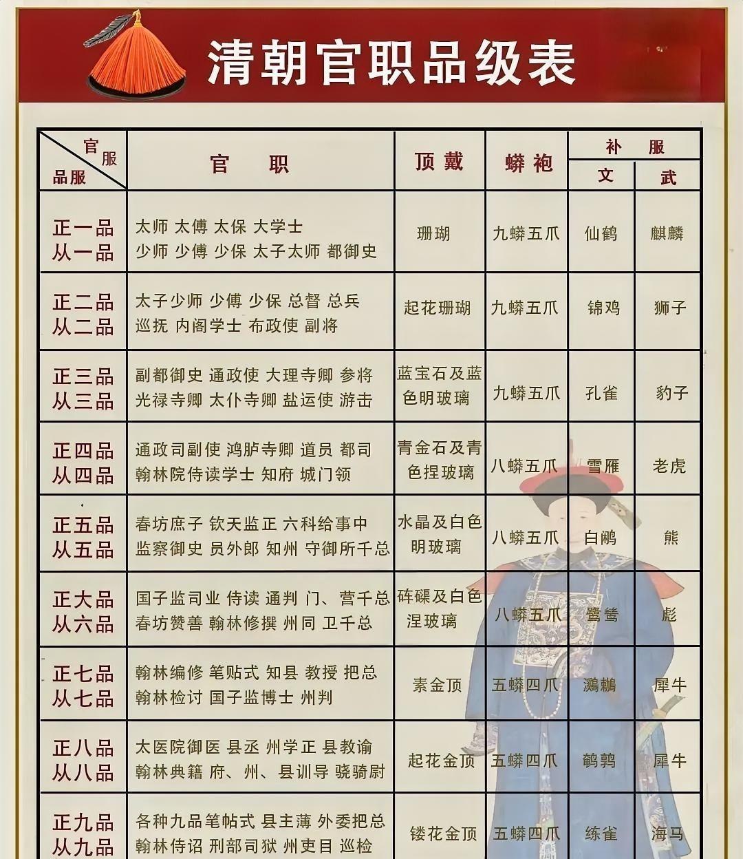 清朝官服飞禽走兽辨文武 观顶戴,知官品: 一品大员头戴鲜艳的红珊瑚顶子,二品为起花珊瑚顶,三品换成蓝宝石顶,到六品则是砗磲白顶,七品以下皆为金顶(素金、起花、镂花可区分更细的品级)。顶戴一眼便能看出尊卑! 数蟒爪,辨地位: 一至三品的高官身着“九蟒五爪”袍服,四至六品降为“八蟒四爪”(图片有误),七品及以下的小官只能穿“五蟒四爪”。蟒与爪数量的差别,彰显着天壤之别的地位! 补服纹样,区分文武: 文官补服绣飞禽:一品绣仙鹤、二品绣锦鸡、三品绣孔雀……直至九品绣练雀; 武官补服绣走兽:一品绣麒麟、二品绣狮子、三品绣豹子……末九品绣海马。 文臣气质飘逸,武将形象威猛,二者泾渭分明! 冠帽之上,尽显阶级!