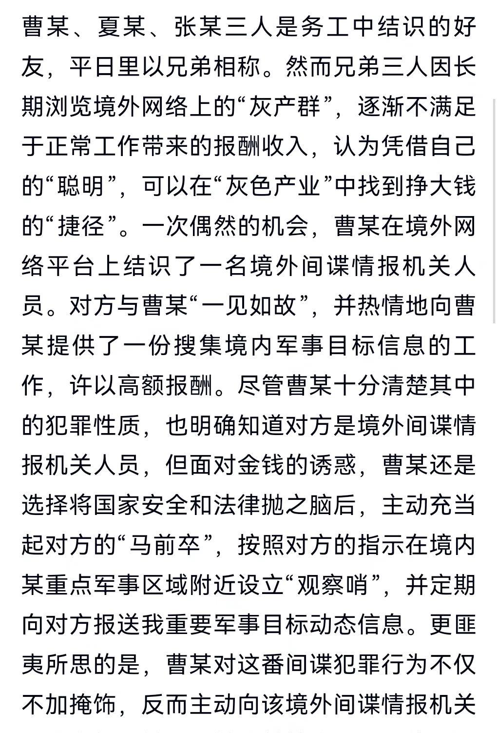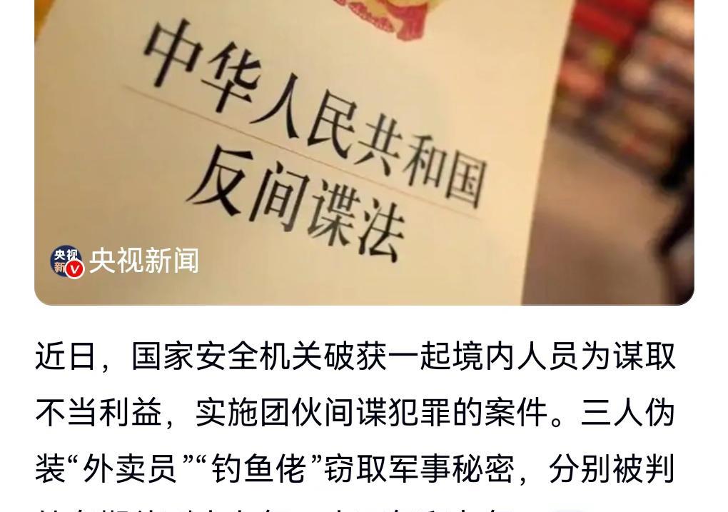 好好的人不做。 偏偏要做汉奸,真的是太可恶了。 9月15日报道,三人伪装外卖员钓鱼佬窃取军事秘密。 三人是打工认识的工友,有一个认识了国外情报机构的人,然后这名男子尝到甜头后,又把自己的两个工友介绍给了对方。 这三人就开始窃取我国的军事秘密报告给对方。 不过天不藏奸,他们最终都背叛了很多年的有期徒刑。 分别被判处17年、13年和9年。 这真是大快人心,也敲响了警钟。#三人伪装窃取军事秘密#