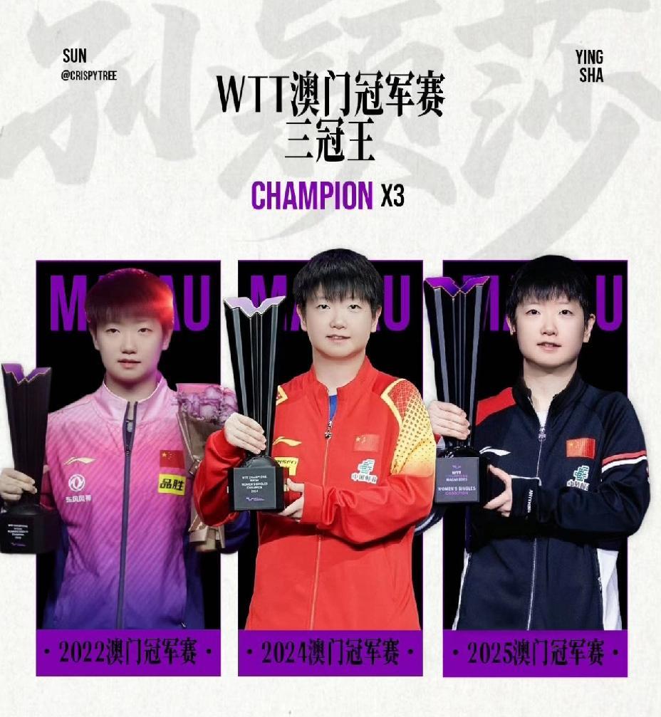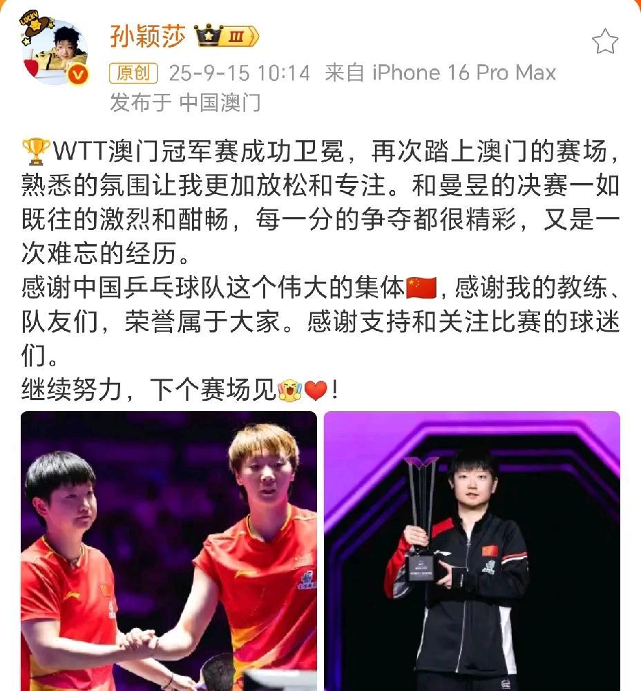 莎莎这就是你的不对了, 每次比赛完发文都是先感谢集体, 感谢教练、感谢队友, 其实你最应该感谢拼搏的自己。 澳门冠军赛孙颖莎成功卫冕, 成为WTT首位澳门冠军赛三冠王。 她发文称这个荣誉属于大家, 没有你的挥汗如雨, 没有你的坚强意志, 哪来的这无上光荣的荣誉。 赛后才知道决赛你是用副拍打得, 这也是细心的球迷们发现的。 你从来不抱怨, 只是一味地自己承担下了所有。 你最该感谢你自己, 这个热血的“小笨蛋”。 澳门冠军赛结束了, 你说最多调整两三天, 马上又要投入到北京大满贯的备战, 而且北满你至少要兼两项, 你怎么能让球迷们不心疼呢? (图片源自于网络) #秋日生活打卡季#