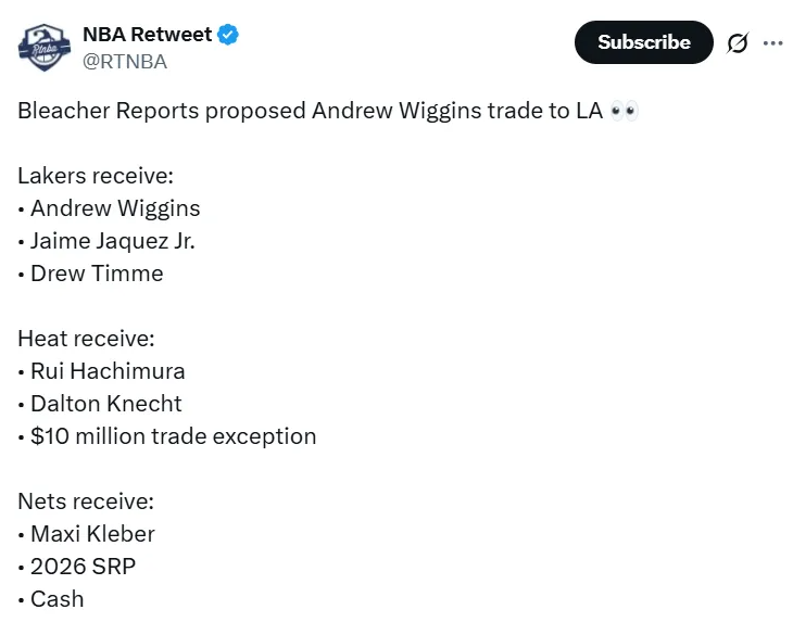 美媒Bleacher Report近日模拟了一笔有关安德鲁-威金斯的三方大交易,具体筹码如下: 湖人得到:安德鲁-威金斯、小海梅-哈克斯、德鲁-蒂米 热火得到:八村垒、多尔顿-克内克特、1000万的交易特例 篮网得到:马克西-克勒贝尔、2026年首轮签、现金 你认为这笔交易是否可行?
