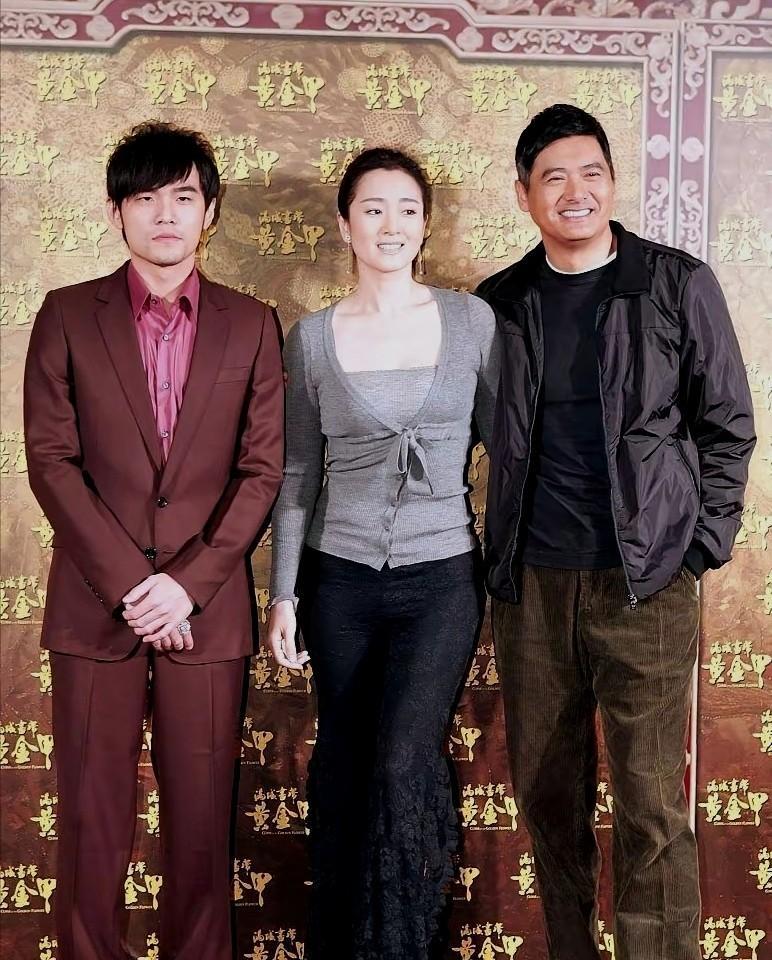 三位巨星难得合影,感觉周杰伦有点多余啊,他的神情、表情咋就这么冷峻、拘谨呢?和一旁巩俐、周润发面露微笑、轻松自然不搭哦。可这就是周董的风格啊,有鲜明的个人特色不好么?