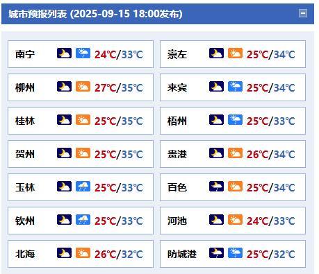#广西天气#【未来三天大部多云到晴 天气炎热 需注意阵性降雨】 今天晚上,全区多云到晴,其中百色、钦州、防城港等市有分散阵雨或雷雨、局地大雨或暴雨。 明天白天,防城港、钦州、北海、玉林、梧州、贵港等市及南宁市南部有小到中雨、局地大雨或暴雨,其它地区多云到晴有分散阵雨或雷雨、局地大雨或暴雨。 森林火险气象等级:桂东南和沿海2级,较低火险;其它地区3级,较高火险。 南宁市:今天晚上多云,明天白天多云、有短时阵雨,东南风1~2级,最低气温25℃,最高气温33℃。 16日晚上到17日白天,全区多云到晴,其中桂南有阵雨或雷雨、局地大雨或暴雨。 17日晚上到18日白天,全区多云到晴有分散阵雨或雷雨、局地大雨。 未来三天,全区大部最高气温33~35℃、局地37℃以上。(广西气象台15日17时发布预报)