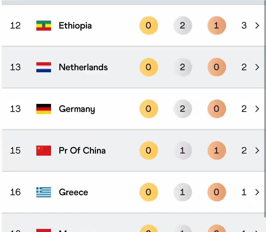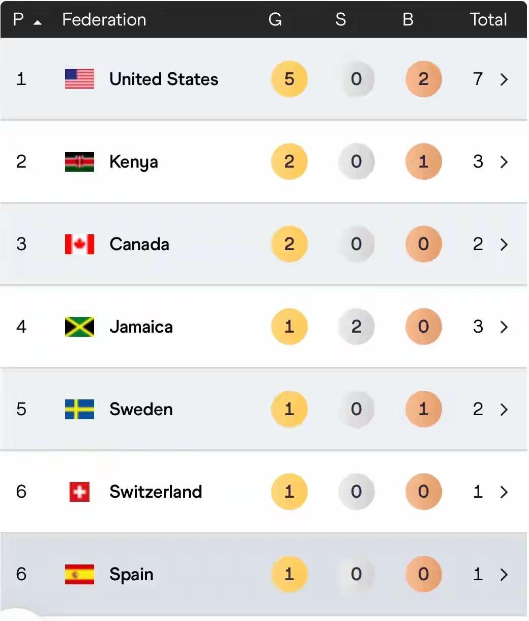 第一仍然是美国5 金2铜 第二肯尼亚2金一铜 第三加拿大2金 第四短跑国家牙买加1金2银 第五瑞典一金一铜 并列第六瑞士,西班牙,新西兰 亚洲田径太落后,西亚雇佣军团不行了,印度呢?
