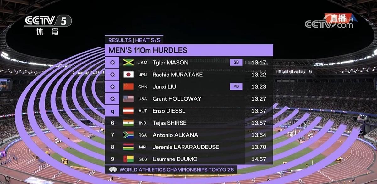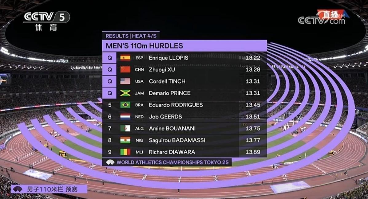 真棒!中国三将齐齐晋级半决赛! 中国另两位选手徐卓一和刘俊茜分别以13秒28和13秒23获得第四小组第二和第五小组第三,直接晋级半决赛。 中国参加男子110栏的三位选手齐齐跻身半决赛,令人刮目相看。