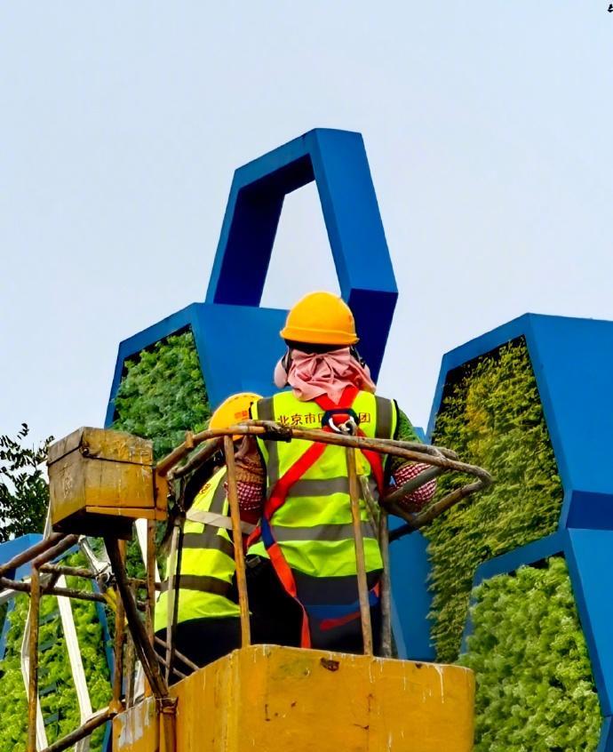 【期待!#长安街花坛开始变身了#】#今天北京真好看# 9月16日上午,北京西单路口花坛实施改造工程,园林工人正在把纪念抗战胜利80周年主题花改制成国庆花坛。(北京日报)