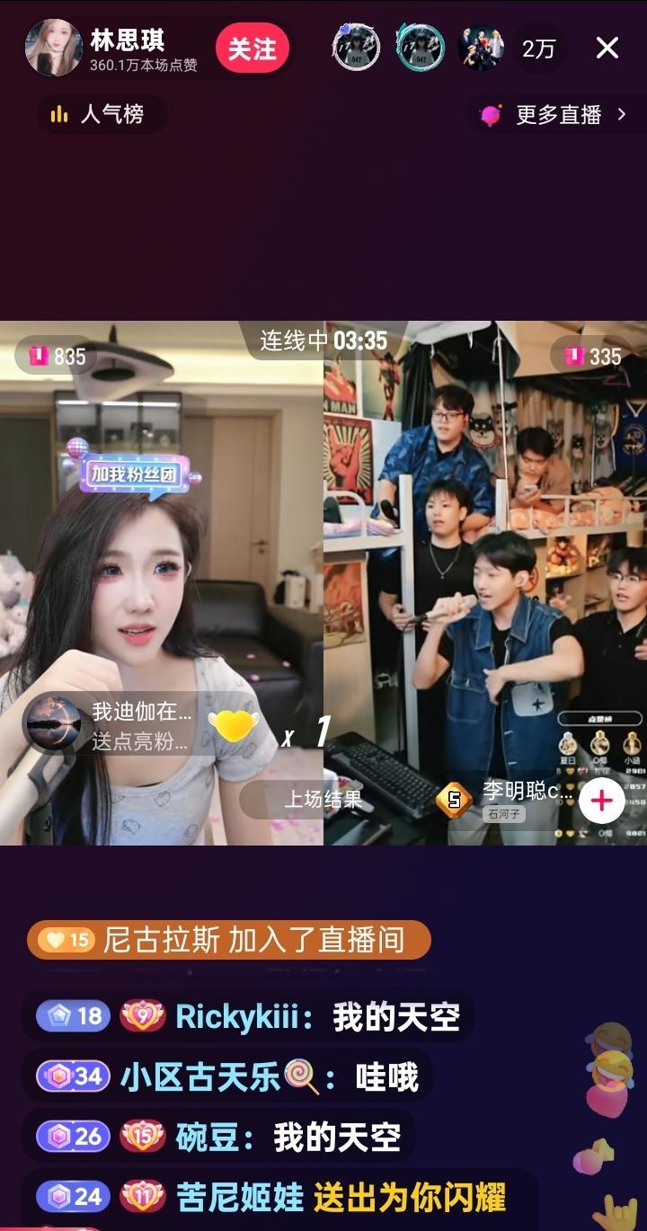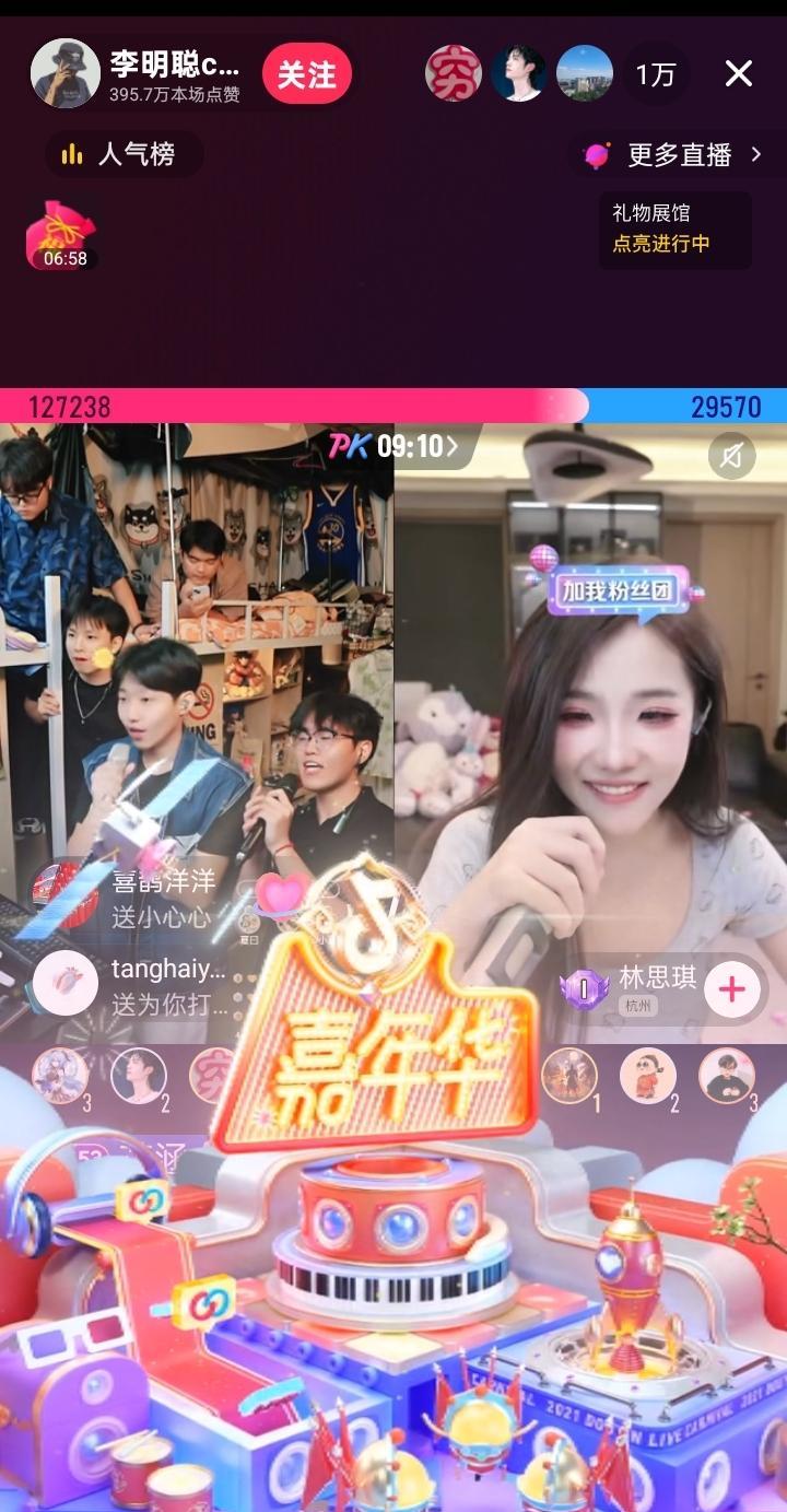 临近下播,李明聪cong接了超级大主播林思琪的麦。五分钟总榜,林思琪居然输了。才艺表演时,林思琪的表情与对其他帅哥明显不一样,似有真情流露,说明她是真心喜欢。才艺表演后,林思琪主动给李明聪cong点关注,不到一分钟的功夫,粉丝增加一万,彼时,林思琪直播间只有二万多人,相当于一半人过来,这号召力也没谁了,同时也说明直播间都是真人。第二场PK获胜后,又送了二个嘉年华。