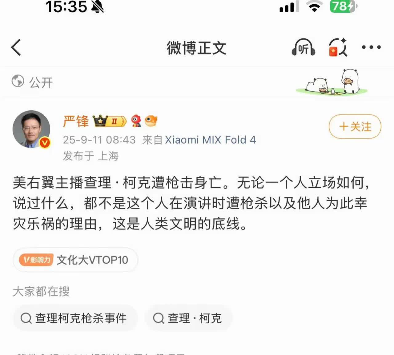 一个美国极右翼反华政客被枪杀,中国网民感觉很痛快,在网上表达一点快乐不是很正常吗?这个家伙对中国如此仇视,难道我们还要表达哀思不成?但复旦大学教授严锋又不乐意了,发表文章说我们是幸灾乐祸,突破人类的文明底线。在看到国内网民的一致讨伐后有些后怕,赶紧删掉了文章,并且写了“不要在他人坟头蹦迪”的文章为自己辩解。请问谁在他人坟头蹦迪了?对一个敌视我国、处处打压我们的人表达不满就是突破人类文明的底线吗?自我解释有什么用,这不就是敢做不敢当吗?有胆量不要删文啊!这种反骨竟然还是复旦大学这样国内名牌高校教授,真是让人不寒而栗啊!