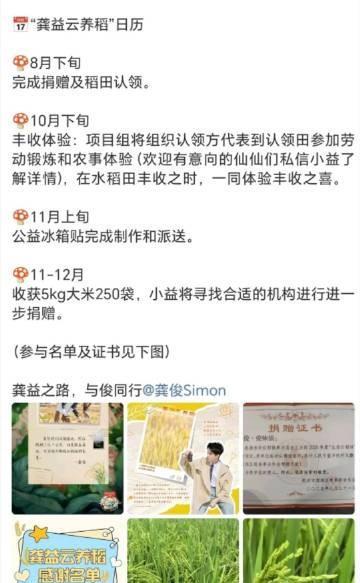 龚俊在马达加斯加飘满稻香的田地里,去重温先辈们的奉献和汗水,去见证愿景达成的美好时刻。 龚俊粉丝以“龚俊·俊味仙”的名义,参与认领"生态云稻田"的公益活动,认领资金19000用于帮扶浙江杭州淳安县低收入农户。后续收获的5kg*250袋的大米还会寻找合适机构进行捐赠。 这才是《花儿与少年同心季》的意义啊,同心且正能量