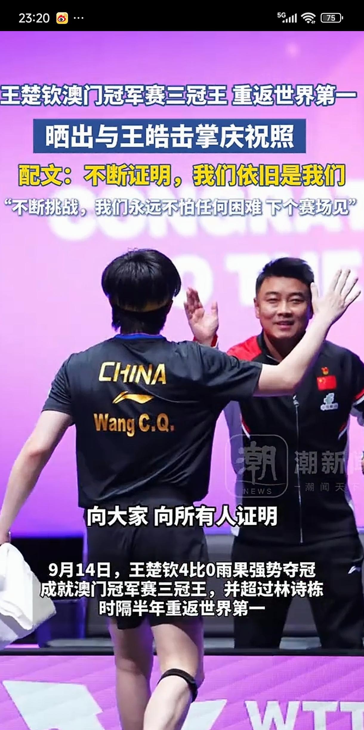 一个大大的开心拥抱,说明了王皓的压力有多大,这是局外人难以想象的重担,近一年来,随着马龙、许欣、樊振东淡出国家队,王皓带着以王楚钦、林诗栋为核心的青年军国家队,经历了了太多,先是澳门世界杯失守,再到后来WTT大满贯赛几站的失利,让大家看清了国乒整体实力的下降,林高远、梁靖崑靠不住,年轻的小将不成熟,尤其林诗栋最近半年输掉了多场外战,目前只有王楚钦一人能够拿得出手,可见王皓、王楚钦的压力有多大!我给王皓一点建议:是时候让樊振东重回国家队了,早点扫清障碍,等樊振东履行完德甲合同之后顺利归队,为洛杉矶奥运会做好传帮带,稳定军心,帮助国乒再创辉煌,大家觉得对吗。