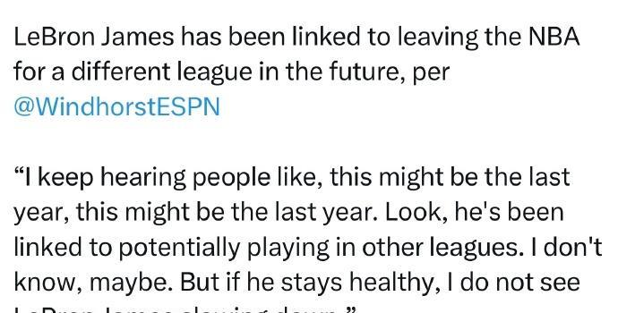 文霍斯特:詹姆斯未来可能会离开NBA,去其他联盟打球。 “我经常听到有人说,这可能是最后一年了,这可能是最后一年了。你看,他可能在其他联赛打球。我不知道,也许吧。但如果他保持健康,我认为勒布朗·詹姆斯不会放慢脚步。”