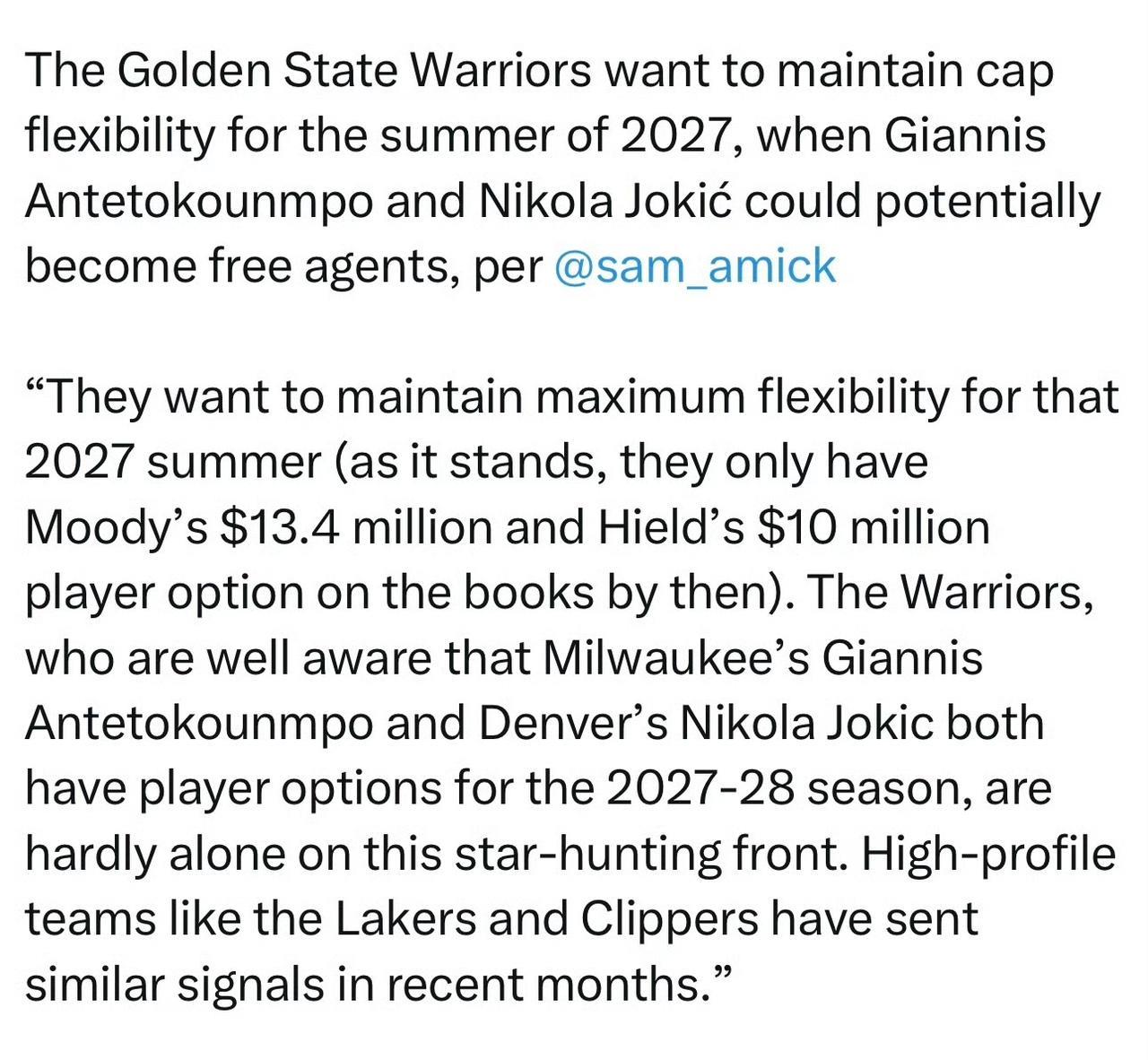 库里28年退役?美媒:勇士腾空空间等约老师、字母哥。 到27年全队合同仅剩穆迪1340万、希尔德1000万(球员选项),最多还有续约的波杰、TJD等新秀。足够签下字母哥、约老师了! 库里合同到期再陪2人打一年,40岁风风光光的退役,完美。 难怪不愿给库明加大合同呢…… 不过这种超巨会轻易换队吗?人冠军有了、金钱欲望也不高,当队史第一不好吗?
