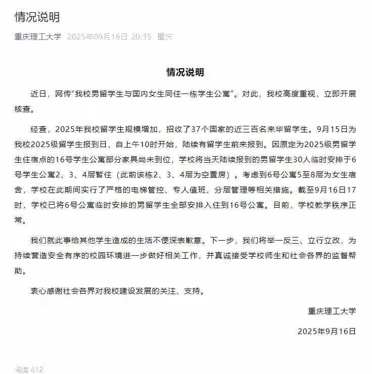 最近重庆理工大学开学时让多名男留学生暂住进女生宿舍,虽然最后学校发布声明承认错误,但大家都觉得敷衍,不在于道歉声明的语气不诚恳,而在于他们避重就轻。 但凡这种涉及外国人的事件,其实最关键的问题不在于男女,而在于双标。如果是国内男大学生,会出现这种事先没通知就直接住进去的情况么?显然不能,为啥换成国外留学生就可以了呢?显然,这才是更值得回应和思考的问题。