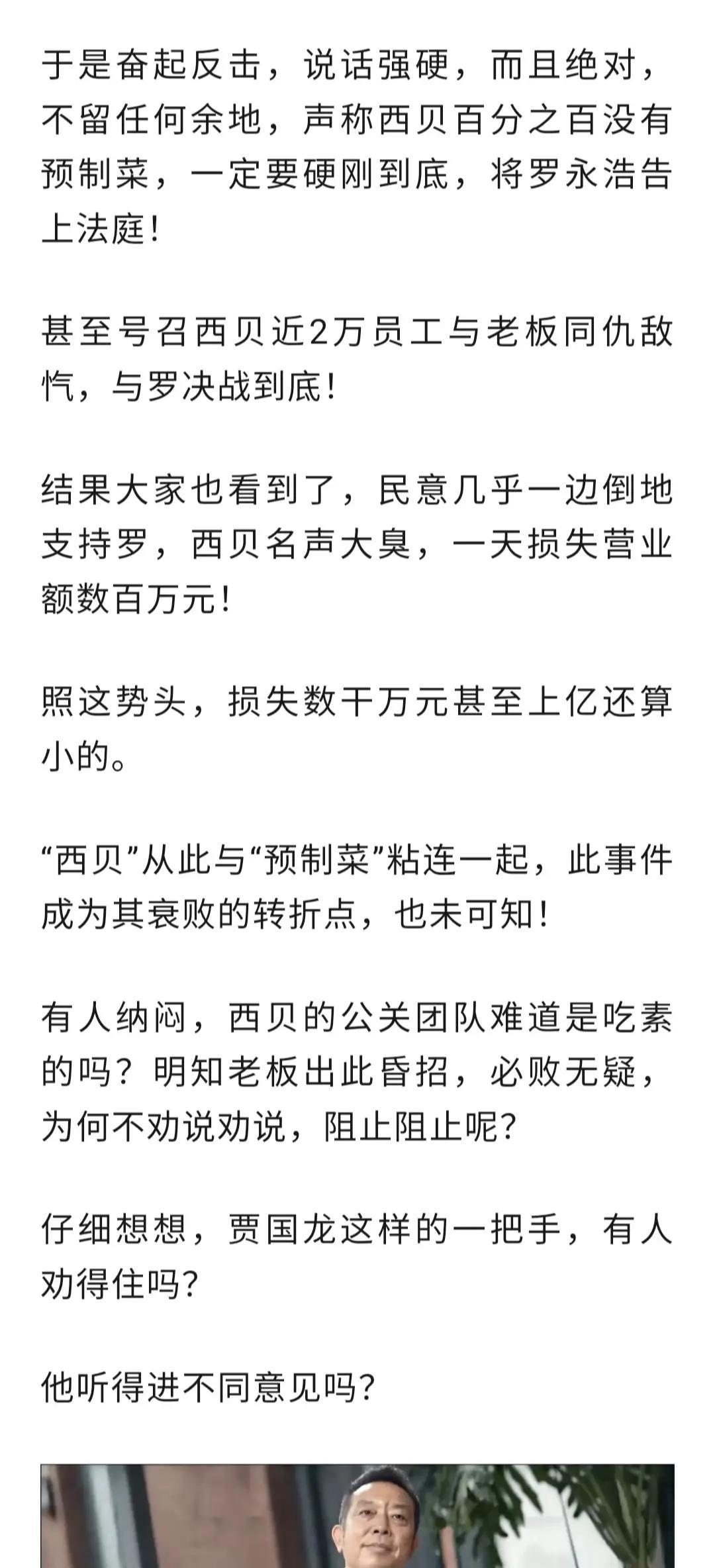 【自古至今,都是看人下菜碟】贾国龙是挺狂傲的,可能因为见过了一些有实权的大官员,对詹总这种退休的媒体老总就很傲气,爱理不理了。 要在古代,王lixia就是巡抚(后来成为总督),而詹总也就是卸任的国家邸报(蛮夷版)的总编。 所以贾就十分傲慢了。 并不是对应低素质,也不是逢场作戏,贾国龙可能邀请的是各路富商权贵,但本人傲慢自负,不懂待客之道,对缺少名望的宾客不热情不敬重,大有一朝得志的派头。 詹主编作为国媒级操笔杆子的,观察别人是本分,点评他人是长项,有感而发写几句,也是情理之中的事,谈不上耿耿于怀,只是启发读者应学会谦虚做人而已[呲牙] 网友:只是一个饭店老板,就牛逼哄哄的,可能是因为出身低,底气不足,修养也差[呲牙] 网友:作者说的对极了,认为所有的人都要敬仰他,围着他转,其实就是一个开饭店的,太高看自己了。[捂脸] 说明贾老板一直不重视媒体的力量。十几年前如此。十几年后还是如此。现在媒体的扩散已经能影响到一个国家的走向了。更不要说只是一个餐饮公司