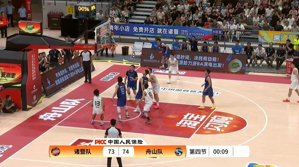 浙BA城市争霸赛诸暨队在主场迎战到访的舟山队,最终两队战至最后一个回合,诸暨队以76:74险胜舟山队,取得城市争霸赛5连胜! 全场技术统计 虽然舟山队目前难求一胜,但是本场比赛客场面对小组第一的对手,他们在前半场快速拉大分差的精彩表现尤其让人印象深刻,全场的顽强表现给诸暨队制造了很大的麻烦,最后十几秒依然难分胜负!期待他们之后的比赛~本场比赛后,诸暨队城市争霸赛的战绩为5胜1负积11分(此前客场58:72不敌杭州、主场72:67胜金华、客场88:66胜湖州、主场96:58胜庆元、客场86:78胜柯城)。舟山队在城市争霸赛的战绩为0胜5负积5分(此前客场75:79不敌嘉兴经开区、客场67:85不敌温州、客场81:87不敌台州、主场79:84不敌余姚)。 诸暨队下一场比赛将在9月27日19:30客场对阵嘉兴经开区队,舟山队下一场比赛将在9月27日19:30主场对阵杭州队。 战至最后一刻诸暨队三分险胜舟山队 前两节,双方比分交替上升,舟山队在第二节快攻拉开分差半场,舟山队44:36领先诸暨队。 上半场技术统计 第三节,舟山队一度拉开十几分,诸暨队后半段逐渐找回状态,缩小分差舟山领先诸暨5分(54:49)进入第四节。 第四节开场诸暨队连续进球,将比分追平、反超!诸暨队继续拉开分差,舟山队在主力缺失的情况下,倒计时3分钟把比分追了回来。诸暨队打出压哨2分,舟山队则两罚全中,双方你来我往,倒计时2分钟,两队战至70:70。 倒计时不到1分钟,舟山领先诸暨1分,倒计时不到10秒,诸暨投出压哨三分再次将比分反超,最终取得胜利。