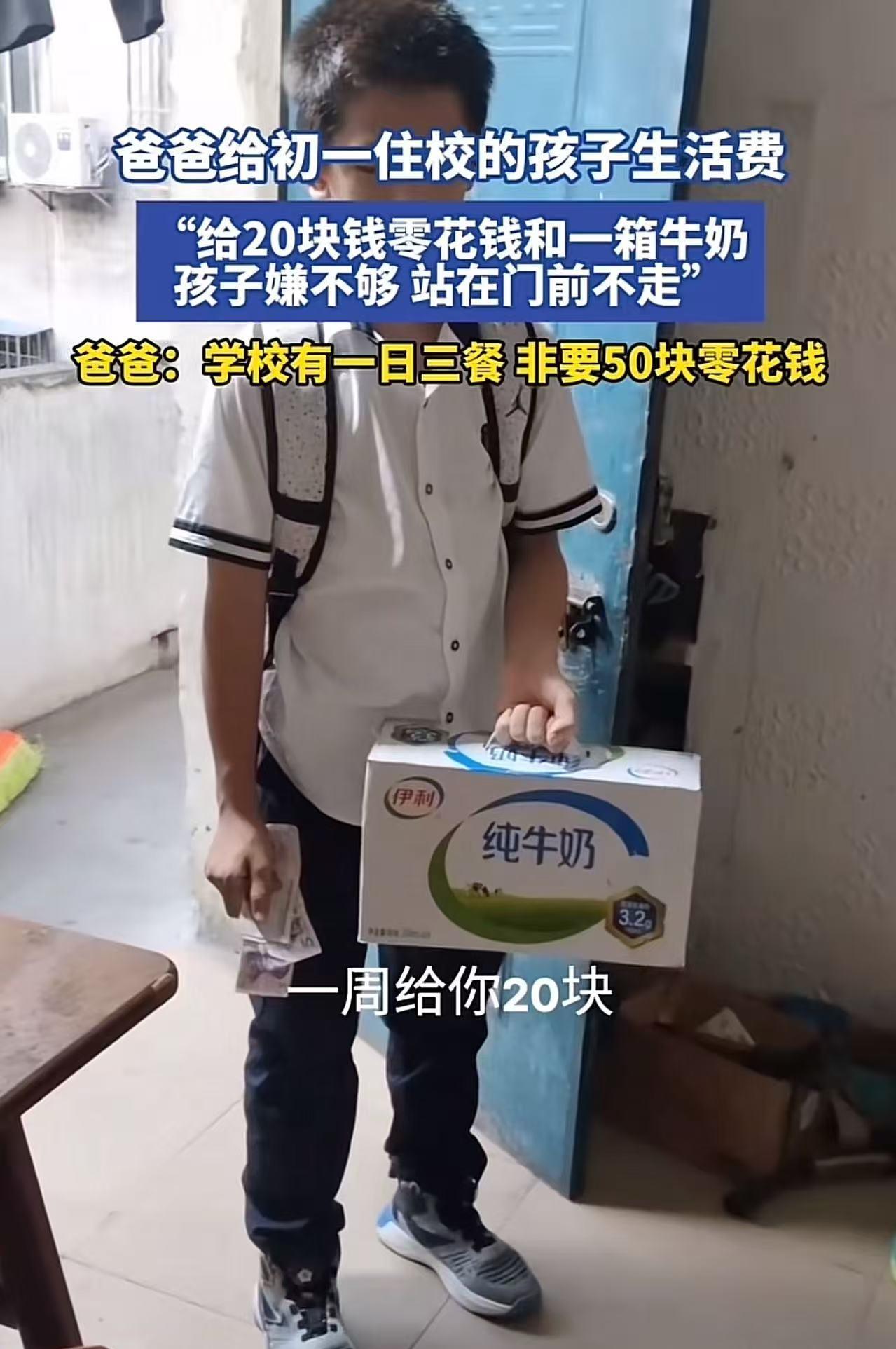 爸爸给初一住校的儿子一周20块零花钱和一箱牛奶,但儿子却嫌不够,站在门前不走!爸爸:“学校有一日三餐,孩子非要50块钱,我该给他吗?”对此,网友吵翻了! 儿子上初一了,因为家离学校比较远,便选择了住校,一个星期才回家一次。 爸爸为了防止儿子乱花钱,煞费苦心地做了一个安排:每周给儿子20块钱当作零花钱,还特意买了一箱牛奶,让儿子带到学校去补充营养。 可谁能想到,当爸爸把20块钱和牛奶递给儿子,准备送他去学校的时候,儿子却站在家门口,嫌弃钱太少,死活不肯走。 爸爸见状,便问道:“你在学校住着,一周20块钱,还有一箱牛奶,这还不够吗?学校里一日三餐都有,你要这些零花钱干啥呀?” 儿子一脸委屈,低着头,抿着嘴,就是不肯挪动脚步。 爸爸觉得不能这么惯着孩子,于是就把这件事发到了网上,想问问网友们的看法。 有网友说,别太苛刻孩子,要给孩子一点可自由支配的资金。钱太少孩子会有自卑感的。初中的时候我没有固定的零花钱,班级里的人都笑我,让我很自卑,到现在都有影响。自卑让我性格内向,弓腰驼背,不敢直视别人,不敢和女生说话! 也有网友说,你以为20块钱是他不走的原因的么,他这个年龄,青春期了,最好面子的,他不是说20块钱一周不够用,而是20块钱在同学眼里是最少的,所以觉得没面子,懂不? 还有网友说,我倒觉得20就够了。学校一日三餐都有,需要有多少零花钱呢?五天时间,一天四块钱零花不能说少吧? 我觉得,要是孩子坚持要这50块钱,那就给他呗。毕竟50块钱也不是什么大数目,平均下来一天也就10块钱零花钱。 而且看这孩子也挺老实的,说不定是真有需要呢!孩子上初一了,和小学可不一样。虽然学校有一日三餐,但上体育课的时候会口渴,得买水喝吧;晚自习结束后,肚子饿得咕咕叫,想买点夜宵垫垫肚子,这点钱根本就不够用。这可不是孩子贪嘴,是真的饿啊。 另外,初中阶段孩子也需要一些社交活动。有些同学晚自习后会一起去食堂吃夜宵,要是他总是不去,很容易就被其他同学孤立了。 作为过来人都知道,读书的时候要是吃不饱,那滋味可太难受了。晚上上完自习,肚子饿得前胸贴后背,吃个泡面或者面包那是必须的,可学校又不会提供这些。 所以,关键在于要了解孩子要钱到底是为了干什么,而不是自己觉得孩子要的钱多了,就一股脑地把事情发到网上去。 在养育孩子的过程中,很多家长常常陷入“自我认为”的误区,总觉得自己给孩子安排的就是最好的,却忽略了孩子真实的想法和需求。 零花钱的多少或许只是表象,背后反映的是家长与孩子之间沟通的缺失。与其在网上寻求他人的评判,不如静下心来,和孩子好好聊聊,听听他们内心的声音。 毕竟,只有真正走进孩子的世界,才能给予他们最恰当的爱与支持!