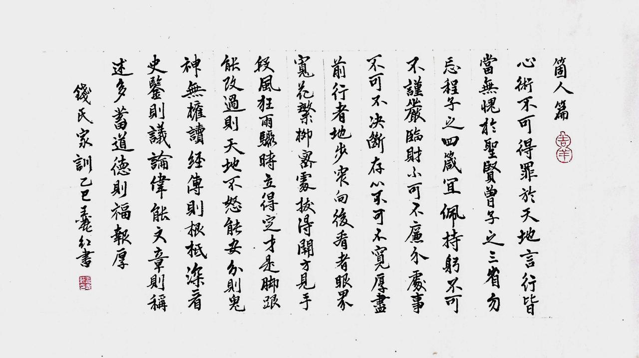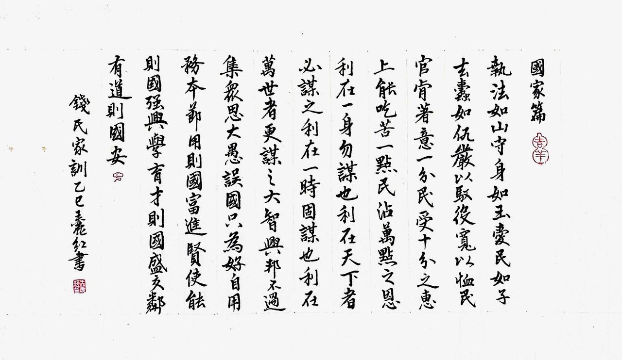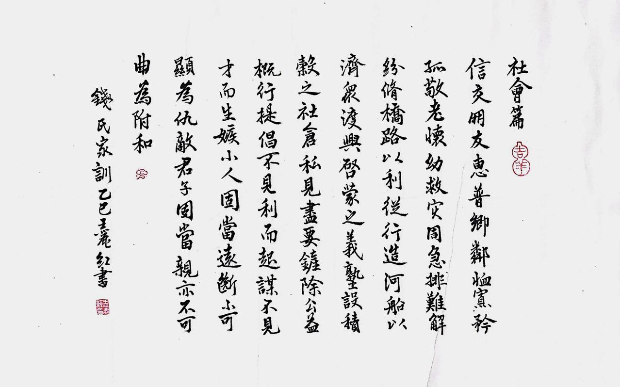 (一) 家庭篇 欲造优美之家庭,须立良好之规则。 内外六闾整洁,尊卑次序谨严。 父母伯叔孝敬欢愉,妯娌弟兄和睦友爱。 祖宗虽远,祭祀宜诚;子孙虽愚,诗书须读。 娶媳求淑女,勿计妆奁;嫁女择佳婿,勿慕富贵。 家富提携宗族,置义塾与公田;岁饥赈济亲朋,筹仁浆与义粟。 勤俭为本,自必丰亨;忠厚传家,乃能长久。 (二) 个人篇 心术不可得罪于天地,言行皆当无愧于圣贤。 曾子之三省勿忘,程子之四箴宜佩。 持躬不可不谨严,临财不可不廉介。 处事不可不决断,存心不可不宽厚。 尽前行者地步窄,向后看者眼界宽。 花繁柳密处拨得开,方见手段;风狂雨骤时立得定,才是脚跟。 能改过则天地不怒,能安分则鬼神无权。 读经传则根柢深,看史鉴则议论伟。 能文章则称述多,蓄道德则福报厚。 三) 社会篇 信交朋友,惠普乡邻。 恤寡矜孤,敬老怀幼。 救灾周急,排难解纷。 修桥路以利从行,造河船以济众渡。 兴启蒙之义塾,设积谷之社仓。 私见尽要铲除,公益概行提倡。 不见利而起谋,不见才而生嫉。 小人固当远,断不可显为仇敌;君子固当亲,亦不可曲为附和。 四) 国家篇 执法如山,守身如玉。 爱民如子,去蠹如仇。 严以驭役,宽以恤民。 官肯著意一分,民受十分之惠; 上能吃苦一点,民沾万点之恩。 利在一身勿谋也,利在天下者必谋之; 利在一时固谋也,利在万世者更谋之。 大智兴邦,不过集众思;大愚误国,只为好自用。 务本节用则国富,进贤使能则国强 兴学育才则国盛,交邻有道则国安。