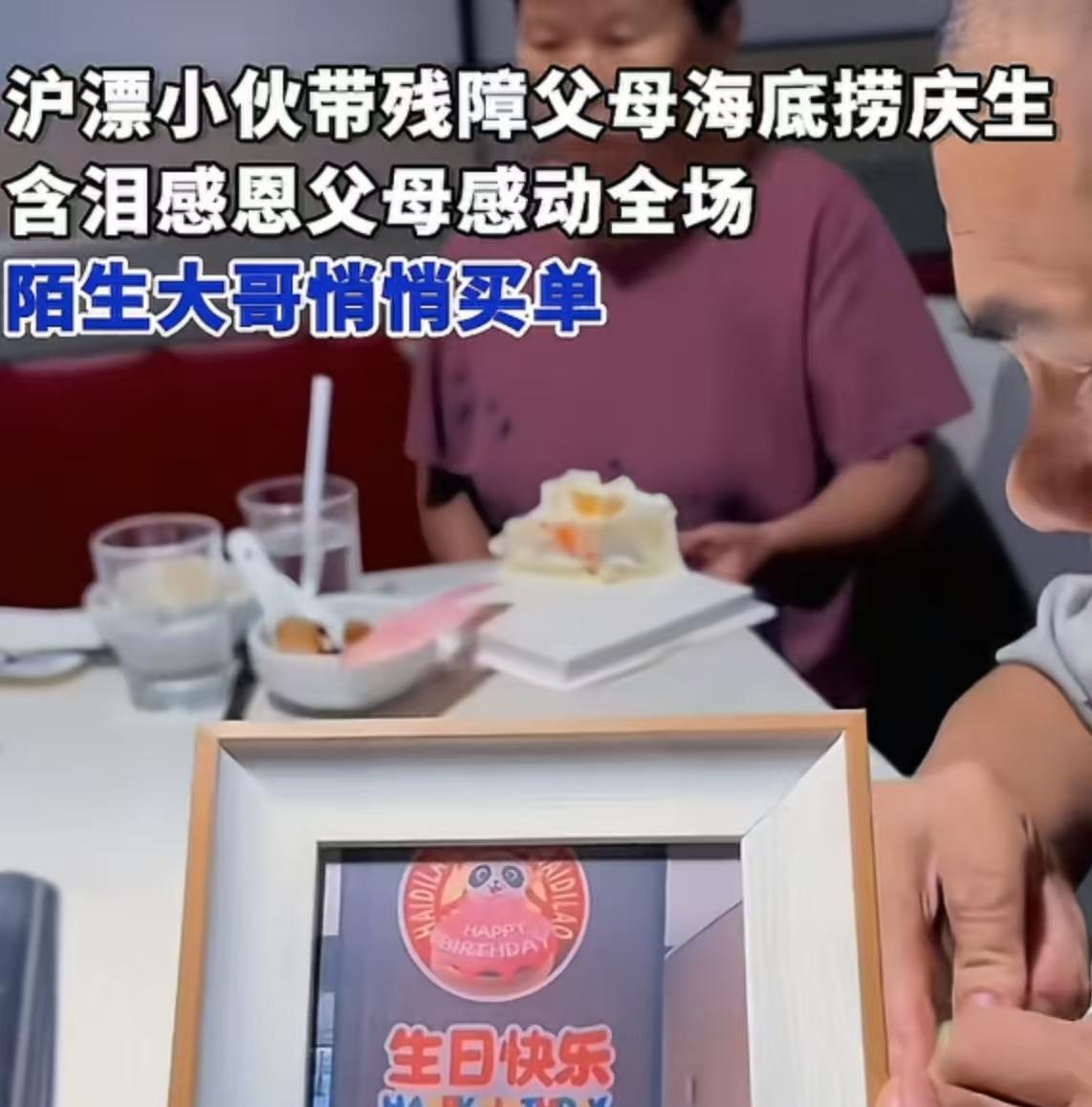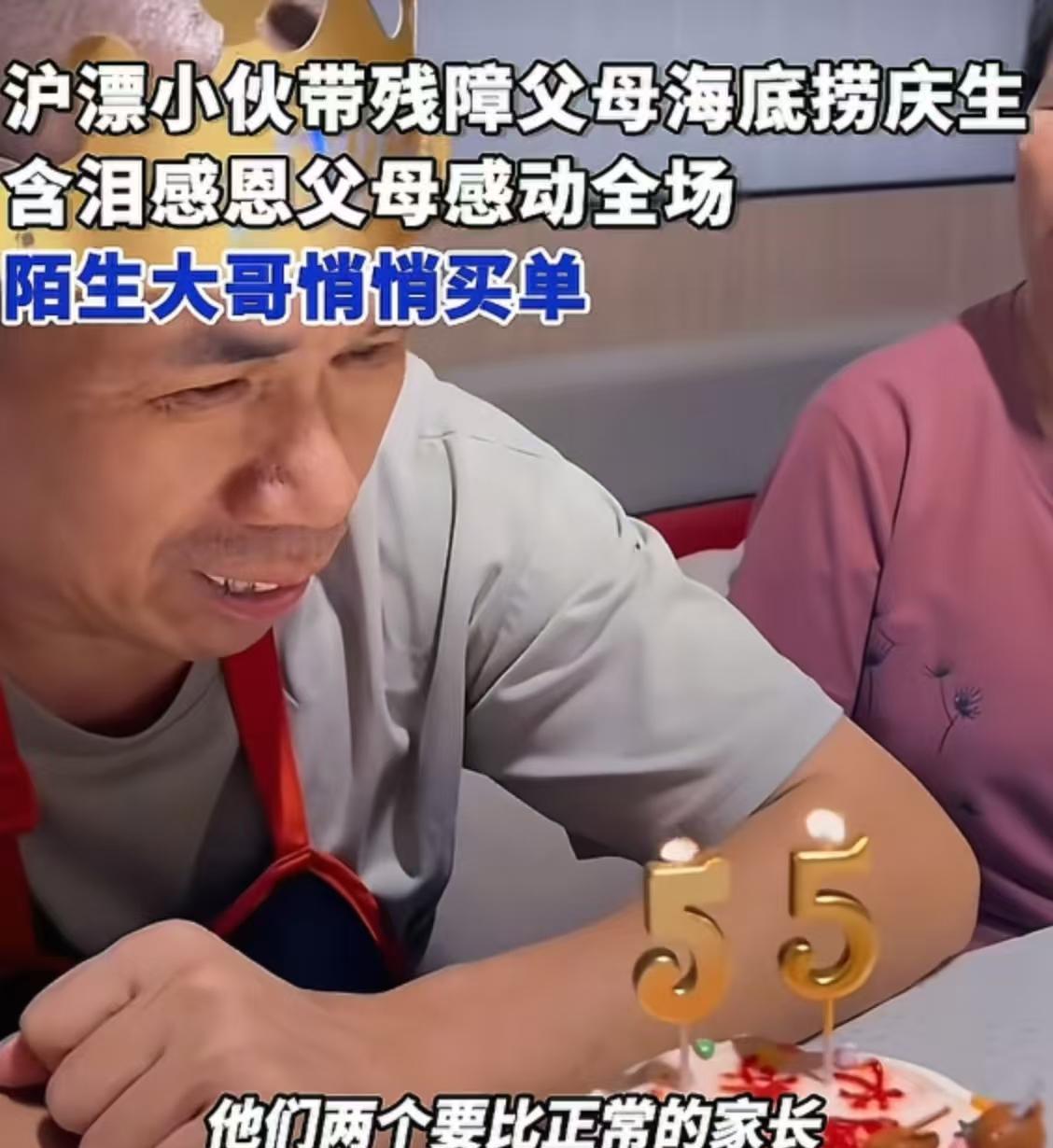 “这份孝心火到新华社!”上海,农村小伙带残障父母在餐厅过生日,含泪演讲感恩父母,陌生大哥悄悄买单!小伙:“我妈精神障碍,我爸近乎失明,55岁了还没有过个一个生日,但他们却靠着拉砖,省吃俭用把我供成村里的第一个大学生。” 小伙名叫杨楼,来自安徽阜阳。命运似乎对他家格外苛刻。他的父亲不幸患上视网膜病变,双眼仅存微弱的光感,几乎等同于失明,而母亲则身患罕见的烟雾病。 父亲因为视力问题,无法外出打工赚钱。但为了供杨楼读书,让他能有更好的未来,父亲毅然决然地去砖厂拉砖。 砖厂的环境非常恶劣,可父亲没有丝毫退缩。母亲虽然身材矮小,只有一米四几,但她也毫不含糊,默默地跟在父亲身后推车。 两人齐心协力,一天下来拉好几车砖。他们所付出的艰辛,比正常家庭的父母要多出数倍,却从未有过一句怨言。 杨楼看在眼里,疼在心里,他暗暗发誓,一定要争气。功夫不负有心人,他成为了村里第一个考上大学的孩子。 毕业后,他凭借自己的努力成为了一名医生。后来,为了能让更多人了解医学知识,他又毅然转行做起了医学科普。现在,他用自己瘦弱的肩膀,独自撑起了这个饱经风霜的家。 这次父亲55岁生日,杨楼觉得父母辛苦了大半辈子,竟然连一个像样的生日都没过过。 于是,他精心策划,偷偷把父母带到了海底 捞,想要给他们一个难忘的生日惊喜。 在海底捞热闹的氛围中,杨楼激动得有些语无伦次,他站起身来,对着周围的人说道:“大家好,我想跟大家说件事。今天是我爸爸55岁的生日,这也是他人生中第一次过生日。 我爸爸妈妈身体都有残疾,但他们靠着在窑厂一块砖一块砖地拉,把我供成了我们村第一个大学生,让我有机会考上安徽理工大学。 我常常在想,如果不是爸妈当年在窑厂那么辛苦地拉砖,我根本不可能考上大学。或许现在的我,还在老家农村的工厂里,过着两班倒、三班倒的辛苦日子。正是因为我考上了大学,才有了机会在上海找到一份稳定的工作,坐在办公室里。 他们虽然身份卑微,生活过得并不容易,但我从来没有嫌弃过他们。今天,我就想给他们过一个隆重的生日,想告诉他们,在我心中,他们无比伟大。我感恩他们为我付出的一切,也深深地爱着他们。 如果没有爸爸妈妈,我的生活不会像现在这样精彩。所以,就算以后再苦再难,我也一定要把他们接到上海来,让他们安享晚年。” 说完,杨楼跪在地上,跟父母磕了几个响头…在场的人都被他的孝心所打动,纷纷鼓起掌来。一位大叔还悄悄地去把杨楼这桌的单买了。 父亲回到家后,兴奋得一夜都没睡着。他感慨地说:“村里的人都叫我‘杨瞎子’,以前没少看不起我。可现在呢,我比村里好多瞧不起我的人都过得好,他们还没过过这么热闹的生日呢!” 此事引发了热议,有网友说,这孩子没有被《原生家庭的错》这句话洗脑,没有抱怨父母,反而拥有中华传统美德,孝道,已经赢了99%的年轻人! 也有网友说,有的人在海底捞感恩父母,有的渣子在海底捞尿尿给父母两百多万的账单! 还有网友说,两个残障人士供出来一位医生儿子,可想而知有多么不容易,为他们点赞! 杨楼的故事就像一束温暖的光,照亮了我们心中最柔软的角落。他用行动诠释了什么是孝顺,什么是感恩。 在生活的重重磨难面前,他没有被打倒,反而凭借自己的努力改变了家庭的命运。他的这份坚韧和担当,以及对父母深深的爱,值得我们每一个人学习!