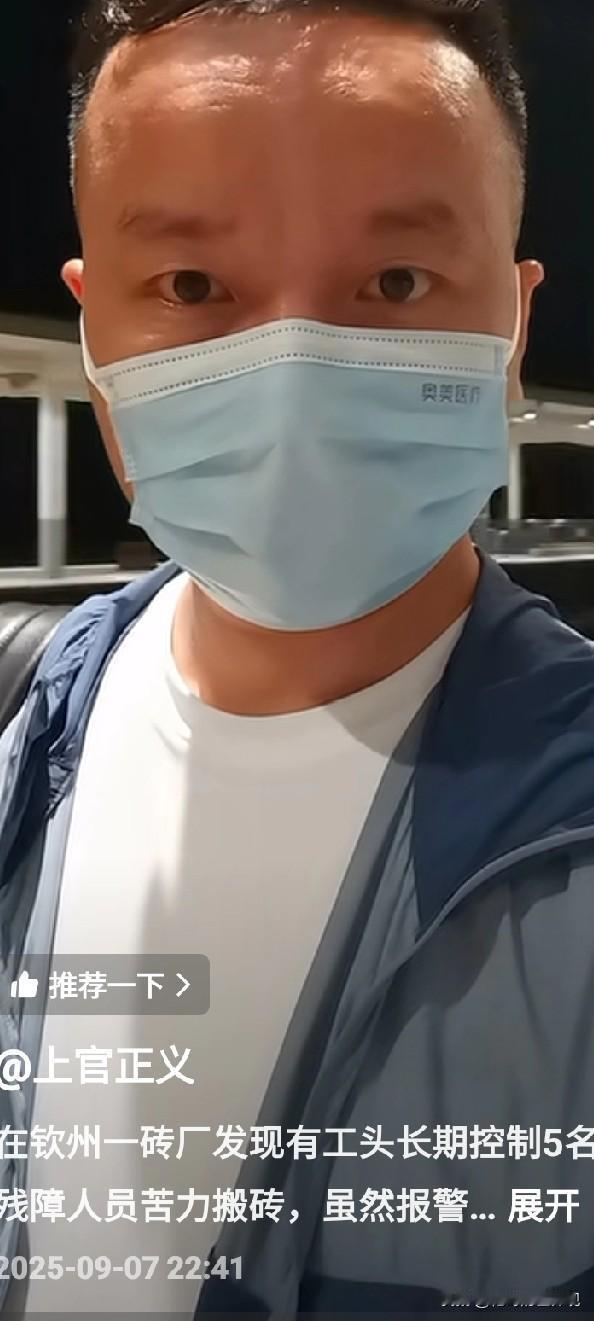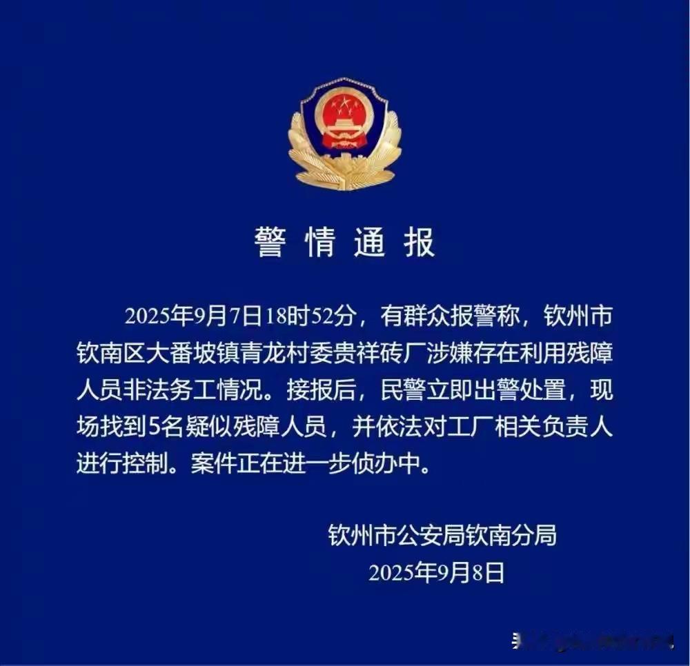 请求钦州警方回复:两名工头抓到没有?抓到了该如何定性? 为什么当事人报警后,两名工头在不知情的情况下会带着残障人士逃跑,到底是哪个环节出了问题?而不是一句正在侦办中。 据钦州警方9月8日消息:现场找到5名疑似残障人士,并依法对工厂相关负责人进行控制。 据悉,9月7日18时52分,钦州警方接到打拐斗士——上官正义举报称:钦州市钦南区大番坡镇青龙村委会贵祥砖厂涉嫌存在利用残障人士非法务工情形。民警立即出警处置,现场找到5名疑似残障人士,并依法对工厂相关负责人进行控制,案件正在进一步侦办中。 真是没想到,十多年前的河北黑砖窑事件,十多年后会在广西钦州上演。除了人性的贪婪之外,是否还有法制的不严呢? 按照《精神病人保护法》,老板和工头首先构成拐卖人口罪,然后才是使用残障人士非法务工,而不是一句轻飘飘的使用疑似残障人士非法务工来定性整个事件。 如果钦州警方对业务不了解、不熟悉,钦州检察院、法院应提前介入,三级联动,让整个事件得到合规合法处理,给人民一个满意的答复。
