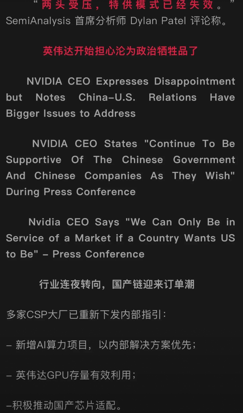 老黄一起床估计两眼一抹黑又得晕过去! 前有“反垄断调查”,后有“指导意见”,让大厂(deepseek、qwen等)带头弃用英伟达。 英伟达已经沦为“地缘政治”的“菜品”,呵呵,稍稍懂点经济的都能知道:“需求”才是产品最大的推动力! 失去全球最大的市场(绝对是我们),黄仁勋估计肠子都悔青了吧! 国家的这反击!精彩啊!