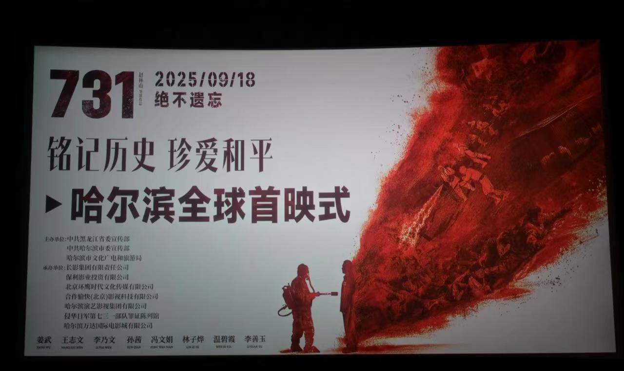 #勿忘国耻,铭记历史,爱我中华# 省委书记许勤、省政协主席蓝绍敏出席观看演出。电影《731》再现了侵华日军七三一部队,在哈尔滨以“给水防疫”为幌子,对中国平民进行活体实验及惨无人道的细菌战研究的真相。 当屏幕上沉重的画面一出现,便揭开了血色伤疤历史,就直刺每位现众的心里,整个现场有的掩面、有的擦泪,甚至有的泣不成声。 影片放映结束后,创作团队与观众还进行了交流。导演赵林山泣声说道:“这个首映必须在哈尔滨,它是一种告慰,对那些逝去的人是一种告慰”。他接着说:“让光影化作历史证据,让影院变成正义的法庭,每一个观众都是审判者,为正义开庭”! 9月18日,该部电影已在全球上映,根据网络统计,截止当天9时18分,《731》上映首日票房已达1.33亿,成为了中国电影历史上单片单日的最高纪录。