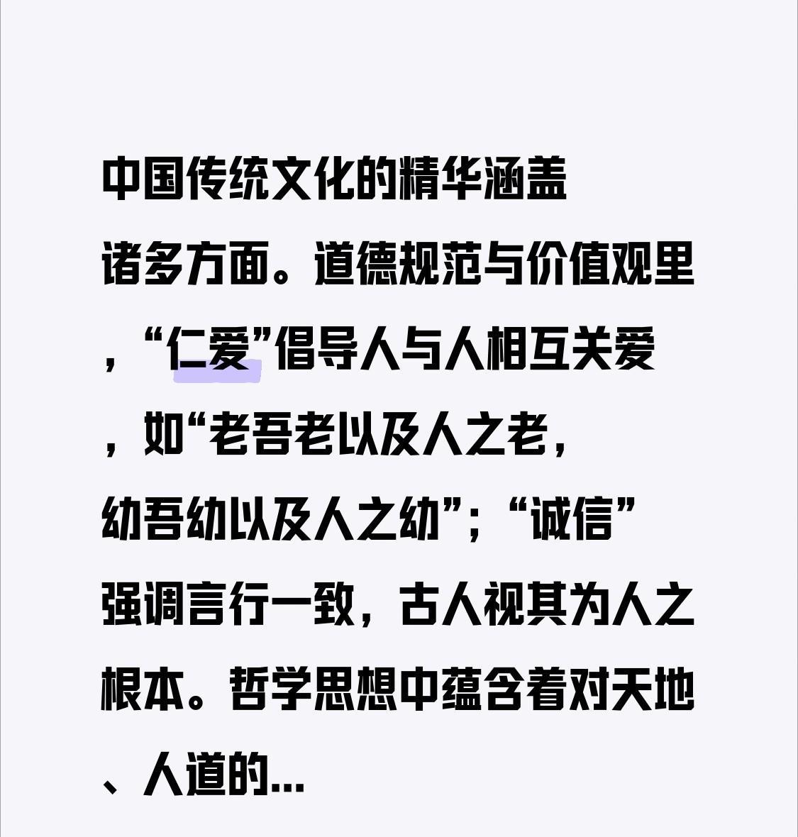 中国传统文化的精华涵盖诸多方面。道德规范与价值观里,“仁爱”倡导人与人相互关爱,如“老吾老以及人之老,幼吾幼以及人之幼”;“诚信”强调言行一致,古人视其为人之根本。哲学思想中蕴含着对天地、人道的深刻理解。 教育理念注重修身养性。审美观念独具东方韵味。而家国情怀里的爱国主义更是精华中的精华,它是中华民族强大生命力的思想基础和精神支柱,让我们在历史长河中凝聚力量、奋勇前行。