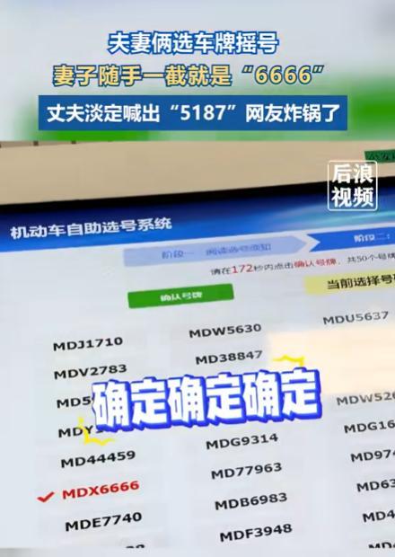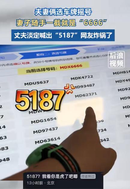 “这就是命啊!”9月17日,江苏,一对夫妇在车管所摇号,妻子随手一截竟然出了“6666”这种极品豹子号,就在妻子点确定时,丈夫却淡定的指向旁边的“5187”,网友:5187?我看你是“虎了吧唧”! (信息来源 :后浪视频 2025年9月16日) 王先生(化名)在前几天提了车之后,就在赶紧和妻子一起去了车管所摇车牌号,因为妻子十分迷信数字,于是在去的路上妻子就对王先生说,一定不要摇到带四的车牌号寓意不好,其它的都可以选。 等他们到车管所之后就给工作人员说了自己要办理的业务,随后便等待去选号码,然而等到他们选号码的时候,屏幕上直接弹出来了一堆号码供他们挑选,这时妻子随便点了一下号码就停止了跳动。 随后他们可以在这一张图片上面任意选一个号码作为自己的车牌号,然而这时候突然有个数字使得妻子的眼睛一亮。那就是四个六,看到这个数字的时候,妻子十分的开心,随后两人直接在现场大叫了起来,觉得他们真的是太幸运了。 然而站在一旁的丈夫却又看到了一个数字5187,这时候他问妻子选哪个,不料妻子没有丝毫犹豫的直接就说一定要选6666的,最后两个人就定了这个四个六的号码。其实这个号码不仅代表着六六大顺,还代表着两人的小确幸。 随后妻子便把这件事情发到了短视频平台上面,不用直接引起了广大网友的喜欢。 有一些人在下面说,看到这么好的数字的车牌就觉得他们是骗人的,因为觉得车牌号代表着地位的象征,根本就不可能让普通人摇到的,说也可能是因为车管所工作人员的失误不小心给弄出来的。 但也有人在下面持反对意见说自己之前也不相信,竟然有人能这么幸运,摇到好的车牌号,但后来因为弟弟买了一辆车,去摇号的时候摇到了四个九,所以他觉得这并不是骗人而是两人的运气确实很好。 还有一些网友在下面调侃说,王先生竟然能够放弃那样好的车牌号去选5187,简直就是不想活了,竟想要“罢妻”,看来还是妻子给的惩罚不够。 那么对于这件事情,你还有什么想说的吗?