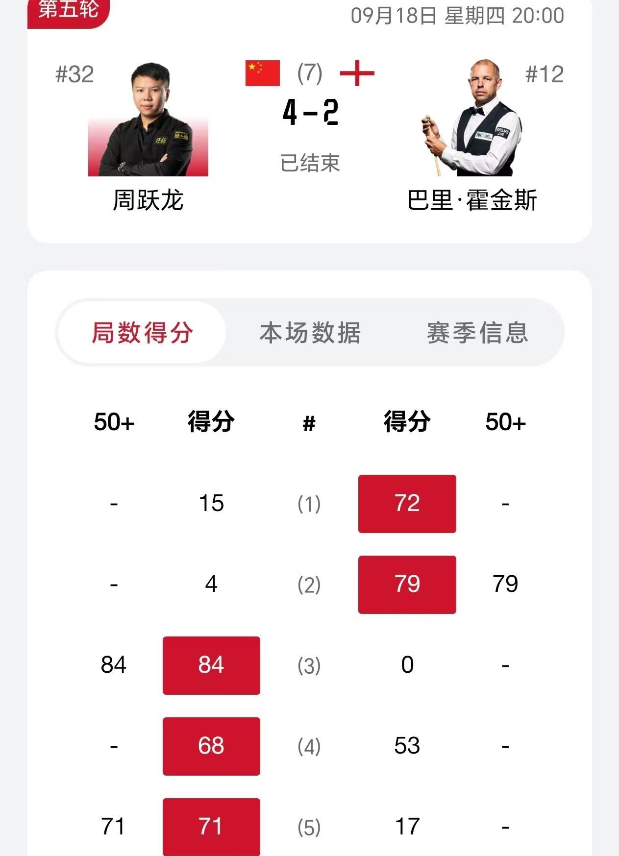 4连鞭!周跃龙0:2落后,4:2逆转巴里-霍金斯,晋级英格兰公开赛8强。 昨天4
