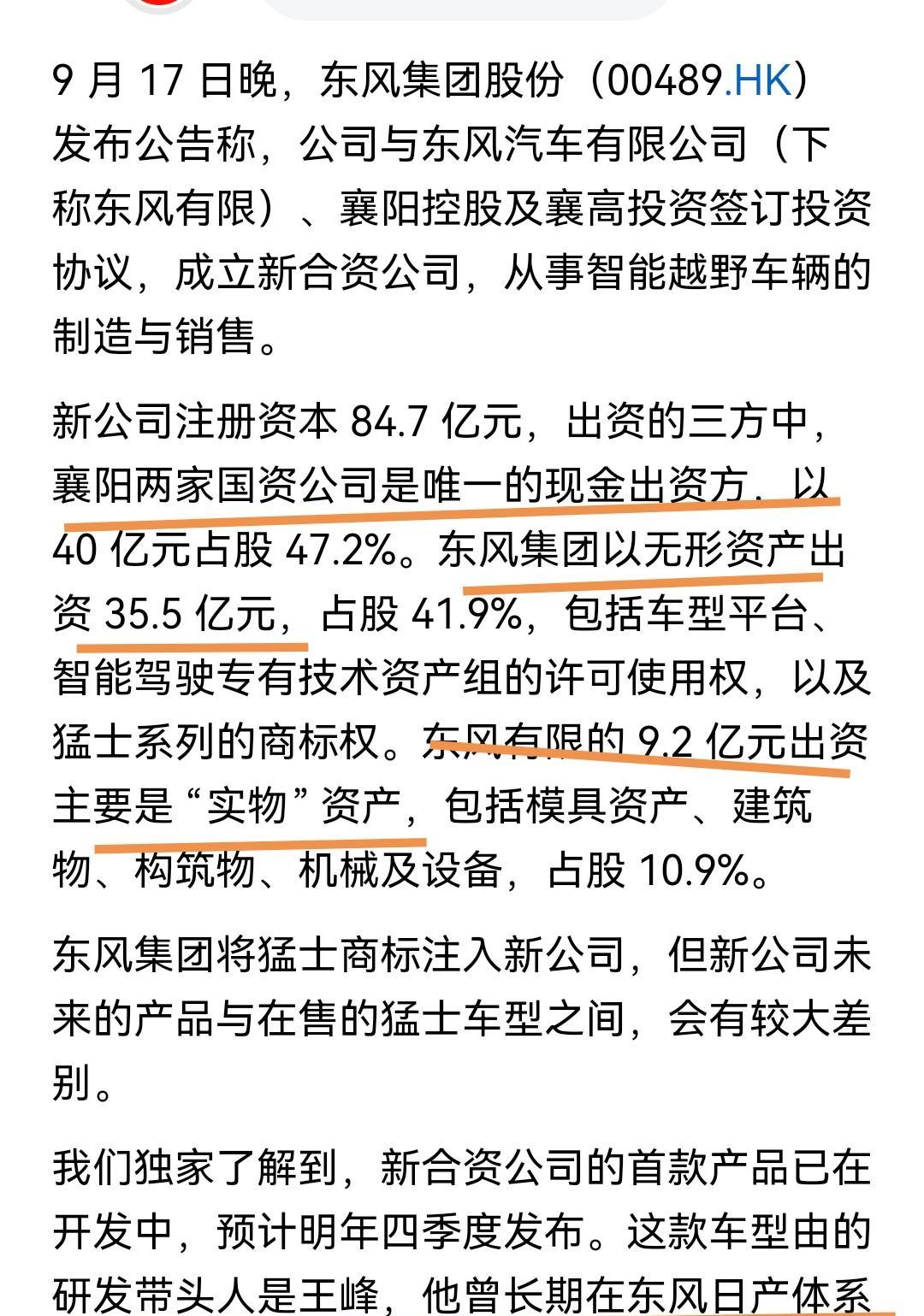 在襄阳与华为合作!注册84.7亿元东风又成立一新的汽车公司?襄阳出钱! 9月17日网传的一则有关东风的消息迅速发酵,那就是东风要成立一家生产制造智能越野车的新公司,而且是多方合作,包含了东风集团、东风日产、襄阳的投资公司,据说还有华为! 从透露的信息来看,简单总结下来就是:东风集团出技术、给用猛士商标这些无形资产作为投资,折算为35.5亿元;东风有限出厂房、出设备这些实物资产折算投资9.2亿元;真正出现金投资的是襄阳控股及襄高投资两家国资公司,出了40亿元。 看来大概率是在日产的襄阳工厂生产了,首款新车型内部代号XY,已经在开发,明年四季度上市!#秋日生活打卡季#