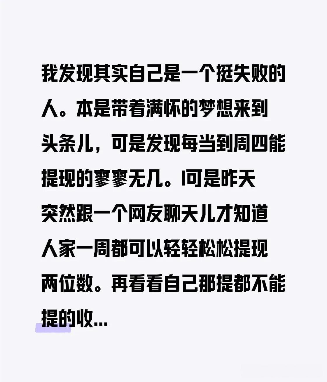 我发现其实自己是一个挺失败的人。 可是昨天突然跟一个网友聊天儿才知道人家一周都可以轻轻松松提现两位数。再看看自己那提都不能提的收入真的是让我有点儿惭愧呀。