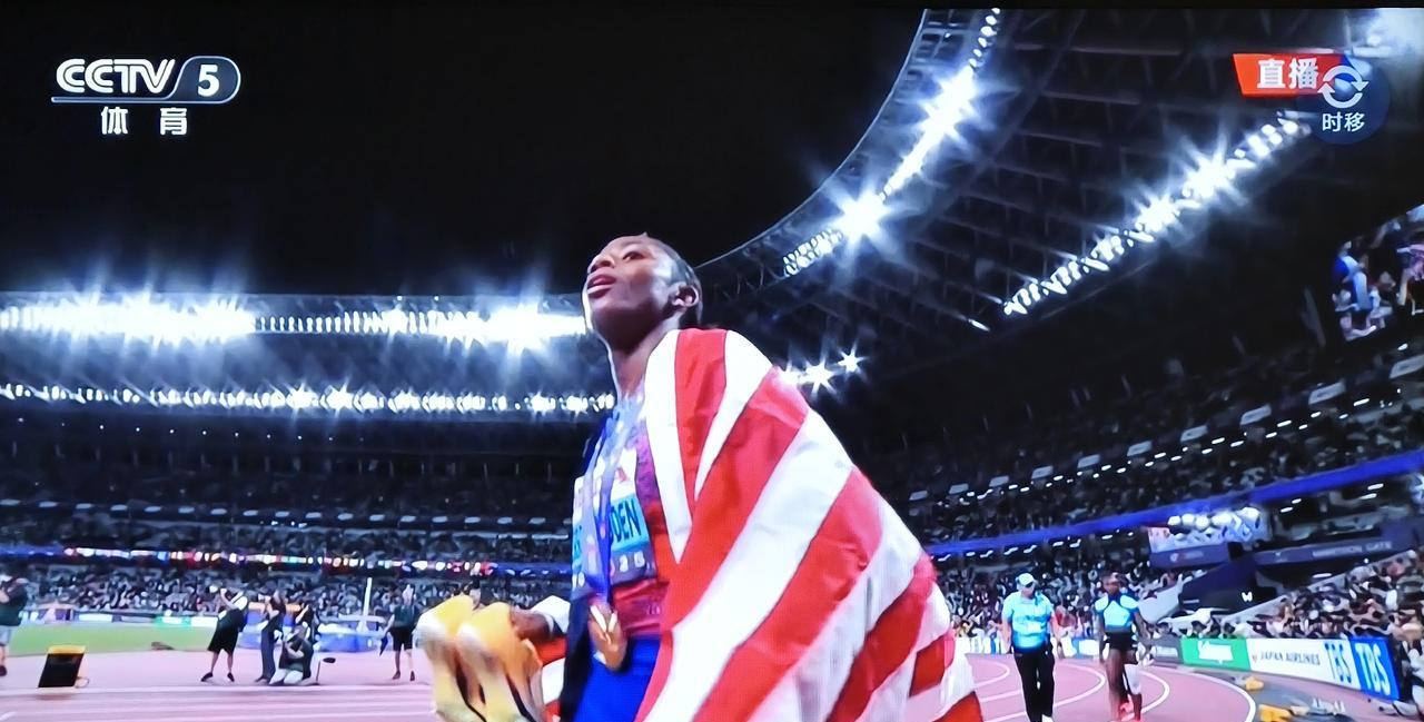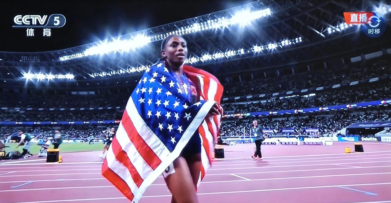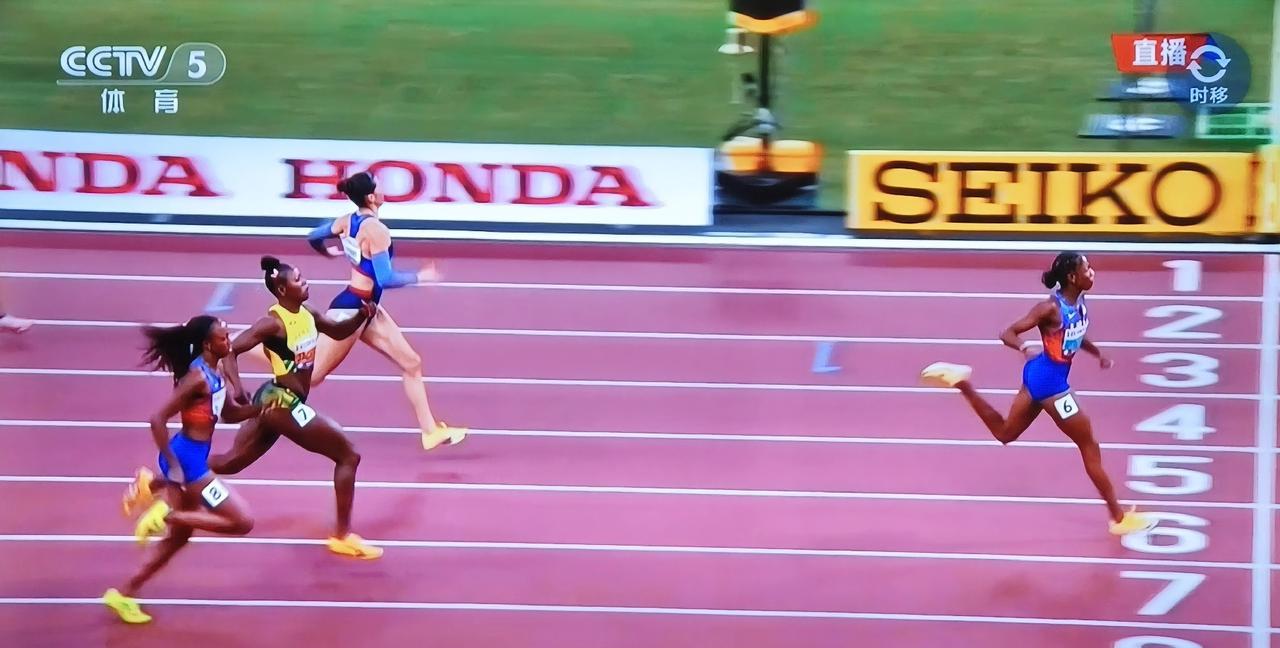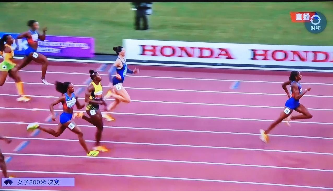 东京田径世锦赛女子200米决赛,已经在100米夺冠的美国选手杰斐逊·伍登在冲刺阶