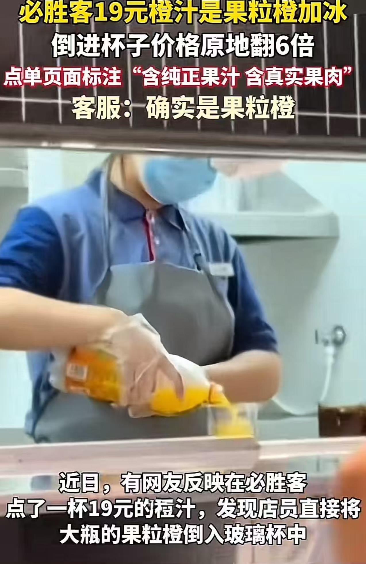 破大防了!有顾客在必胜客点了19元一杯橙汁,万万没想到,店员居然毫无避讳的当着他的面,打开果粒橙倒出来,然后加点冰扣端给顾客。顾客:“倒进杯子价格原地翻6倍,把我当猪宰是吗?” 顾客觉得喝饮料对身体不好,就想喝鲜榨橙汁,可一般的店铺他又不太放心,担心卫生不达标或者用料不新鲜。 思来想去,他选择了必胜客,毕竟点单页面上明确标注着“含纯正果汁,含真实果肉”,顾客理所当然地就以为这是鲜榨的橙汁,为了这份“健康”和“品质”,19元一杯的价格他也认了。 可是,现实却给了他沉重的一击。他点完单后,亲眼目睹店员转身就从冰柜里拿出一瓶果粒橙饮料,动作娴熟地倒进杯子,再加入几块冰块,一杯所谓的“特制橙汁”就制作完成了。 顾客当时就愣在原地,脑子一片空白。19元一杯的橙汁,容量也就约280毫升,而市面上同样一瓶450毫升的果粒橙,售价才不过3元左右。 就这么简单地倒进杯子里,价格就像坐了火箭一样,翻了整整6倍。 顾客心里越想越不是滋味,忍不住在心里嘀咕:“要是提前告诉我这橙汁就是用果粒橙做的,我难道不会去便利店花3块钱买一瓶,自己回家想怎么喝就怎么喝吗?” 顾客越想越气愤,实在咽不下这口气,便忍不住把这件事情发到了网上吐槽。 而必胜客的客服回应更是让人哭笑不得:“确实是果粒橙……” 此事引发了热议,有网友说,正常。卖的是场地和服务。酒吧和高级餐厅一瓶超市4元的青岛啤酒卖40元,大家都在喝啊。 也有网友说,某莱士的更搞笑,当着我面倒了半杯可乐,又兑了半杯自来水,再放了点冰,就这么水灵灵的递给我,真当顾客是死人啊,我出门就倒店门口,从此不再去,现在那家店关门了。 还有网友说,说明果粒橙确实真材实料,但你们就是懒,非要别人给你倒,那就只好收点服务费了。 连必胜客这样的大品牌都难免让人失望,令人唏嘘。看来,名气与口碑并不能完全等同于品质保证,我们对知名品牌的信任或许需要重新审视了。 在这件事情上,必胜客的行为无疑是在消费顾客的信任。商家以所谓的“含纯正果汁,含真实果肉”为噱头吸引顾客,让顾客误以为是鲜榨橙汁,然后用廉价的果粒橙饮料来替代,这种挂羊头卖狗肉的做法,不仅严重损害了消费者的权益,更是对商业诚信的公然践踏。 如果商家都如此肆无忌惮地欺骗消费者,那市场的公平与秩序又将何在?长此以往,消费者还能对市场上的商品和服务抱有信心吗?商家若想长久发展,诚信经营才是根本,任何投机取巧、弄虚作假的行为,最终都只会自食恶果! 那么,你对此事怎么看呢?