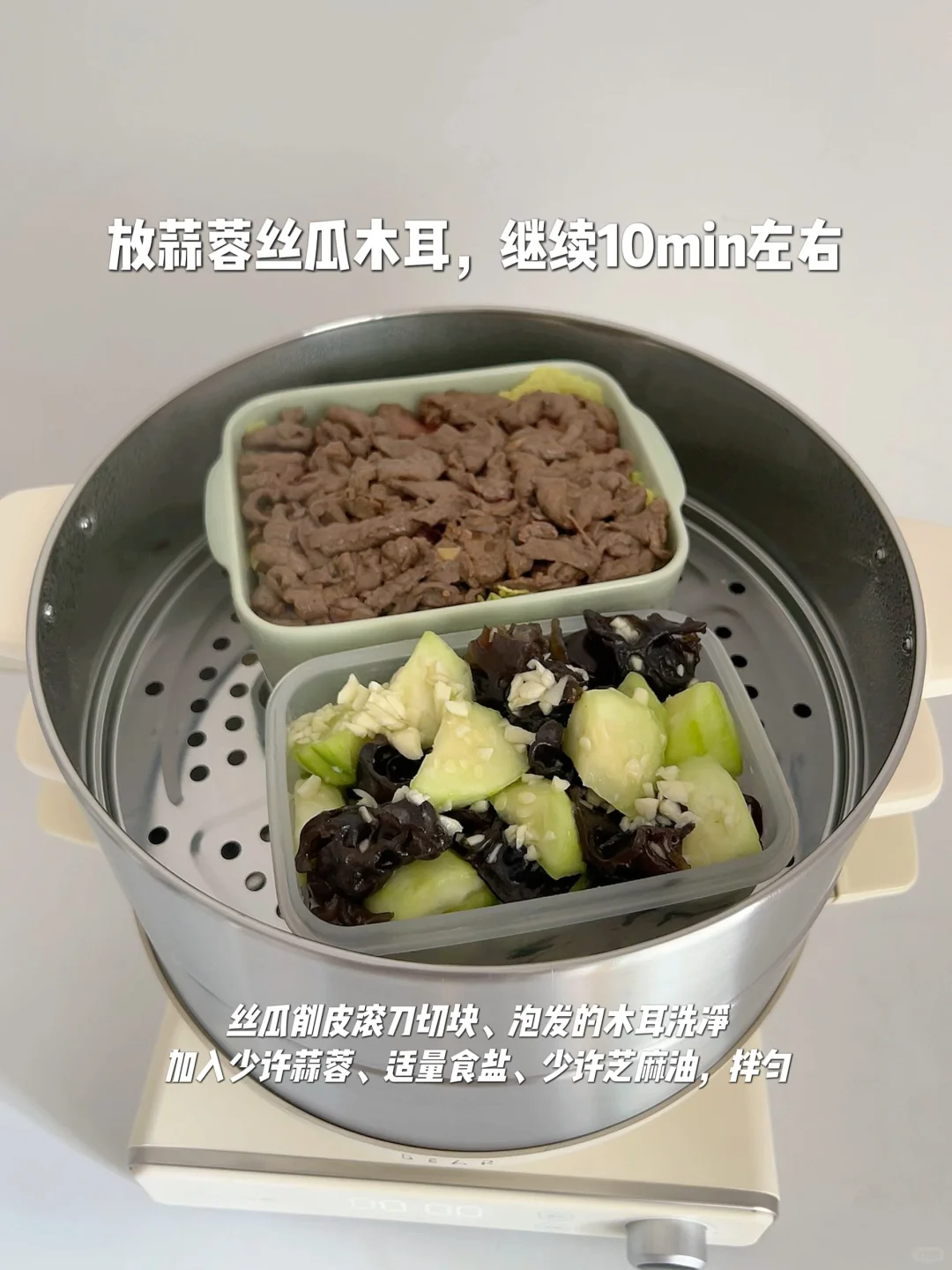 金针菇鸡腿&大米先蒸15min左右 ➡️ 放娃娃菜牛肉,继续5min左右 ➡️ 放丝瓜木耳,继续10min左右。