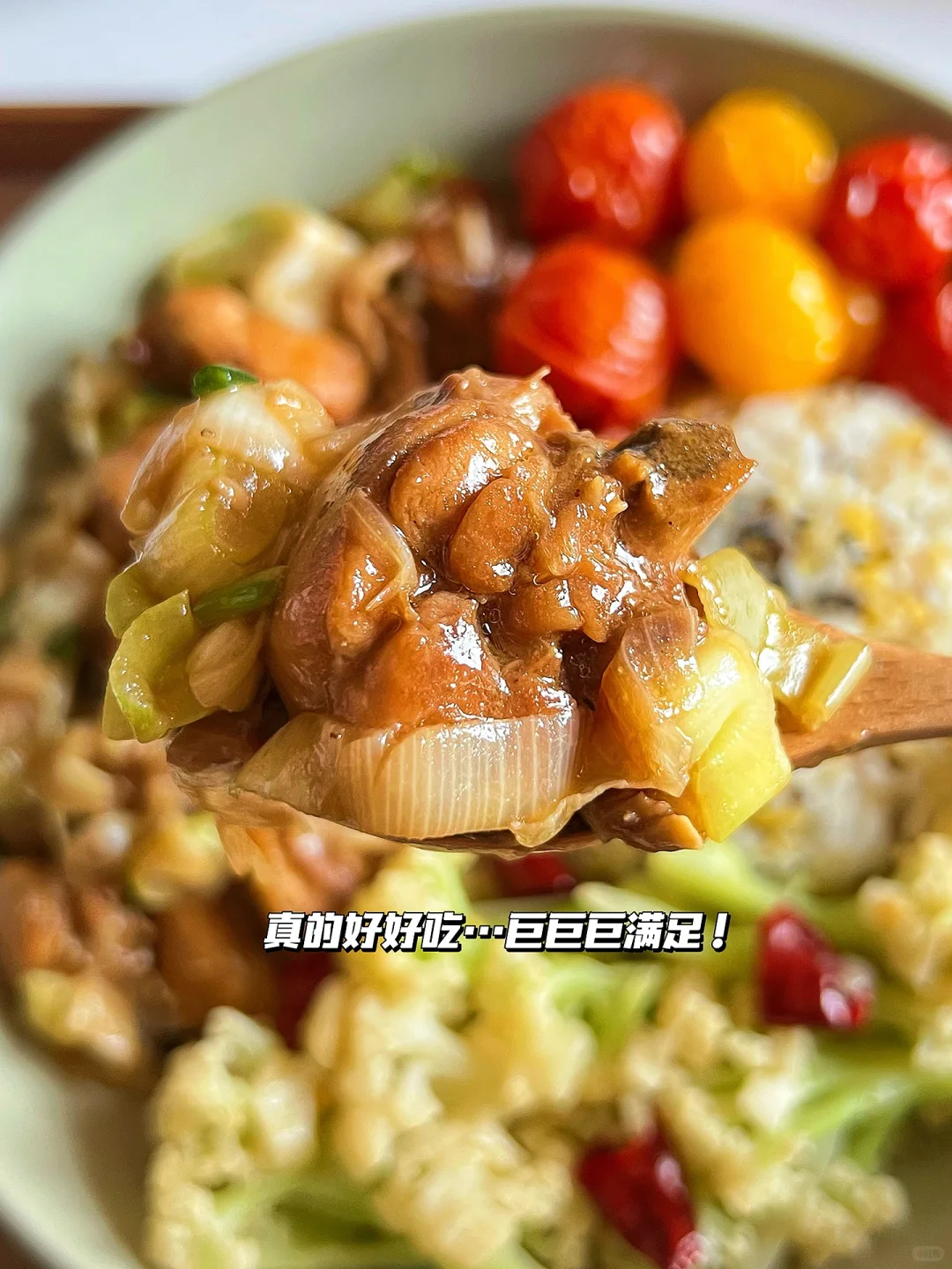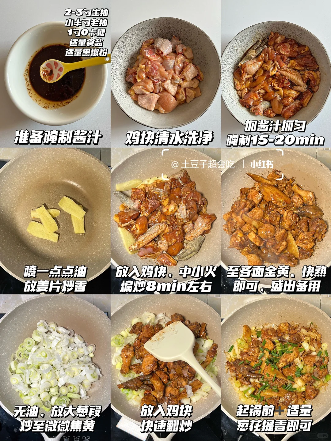 3⃣️ 无油,放入大葱段炒至微微焦黄,然后放入鸡块快速翻炒,起锅前➕适量葱花提香即可。