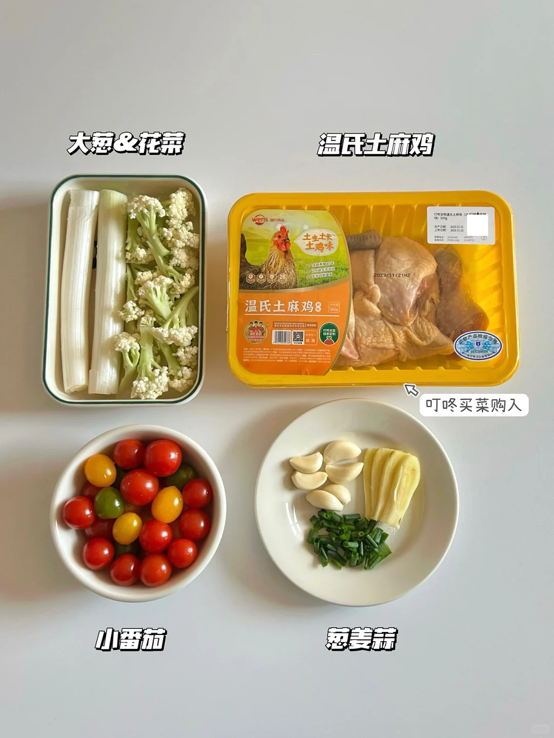 🍅食材准备:温氏土麻鸡、大葱、花菜、小番茄、葱姜蒜/干辣椒