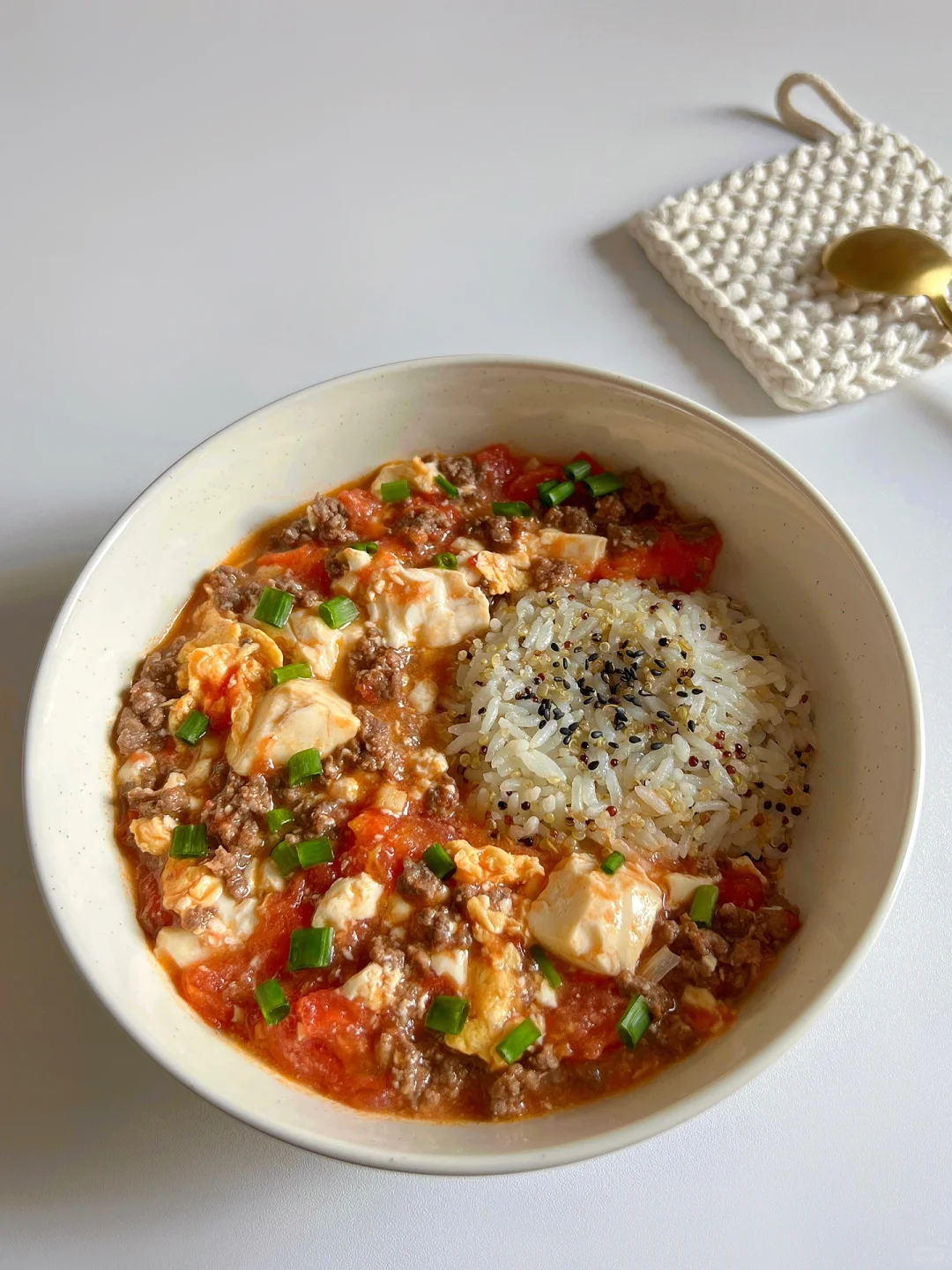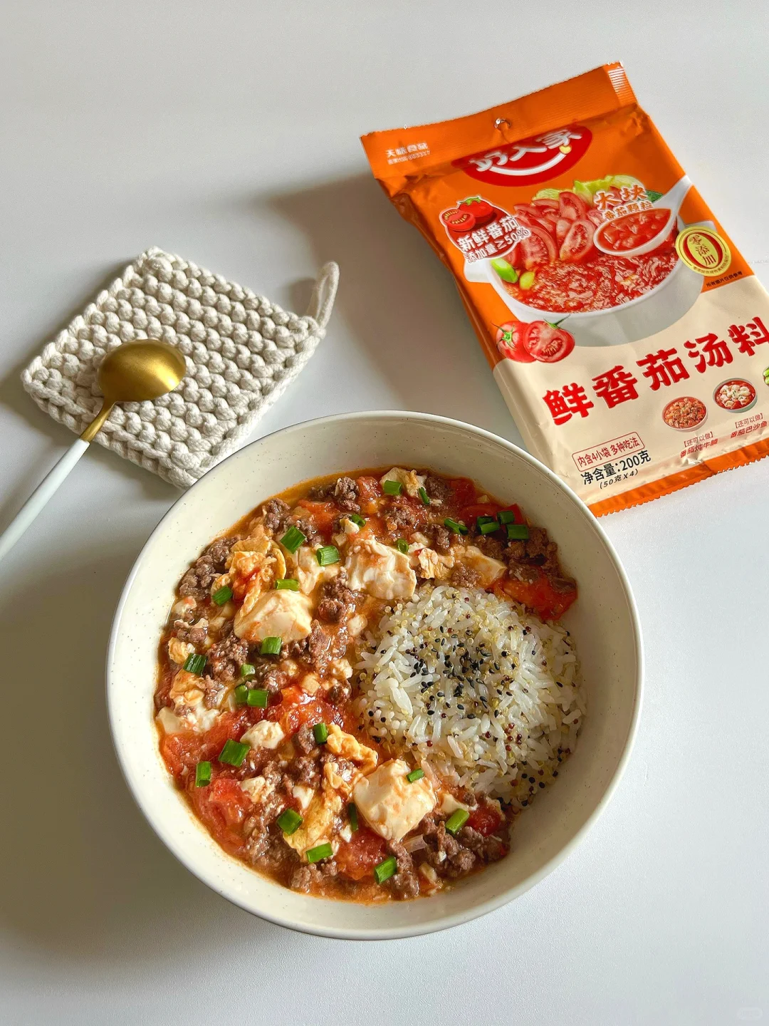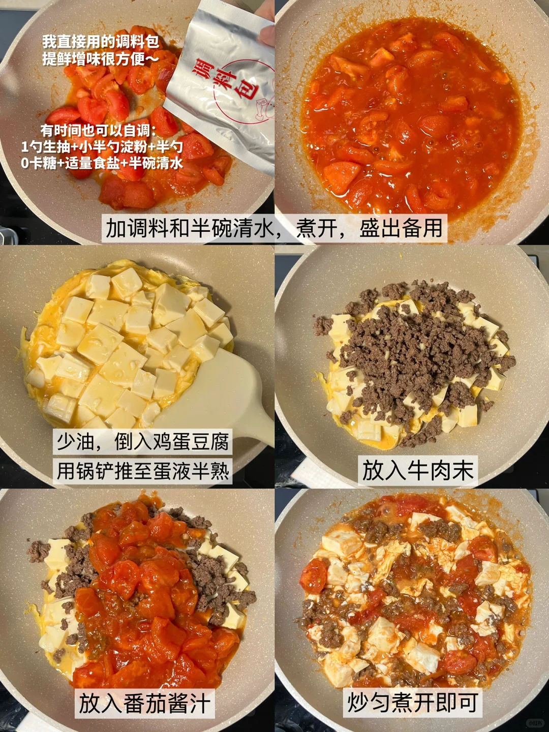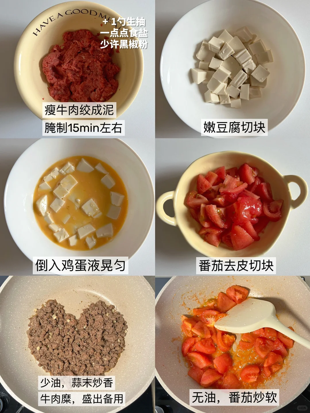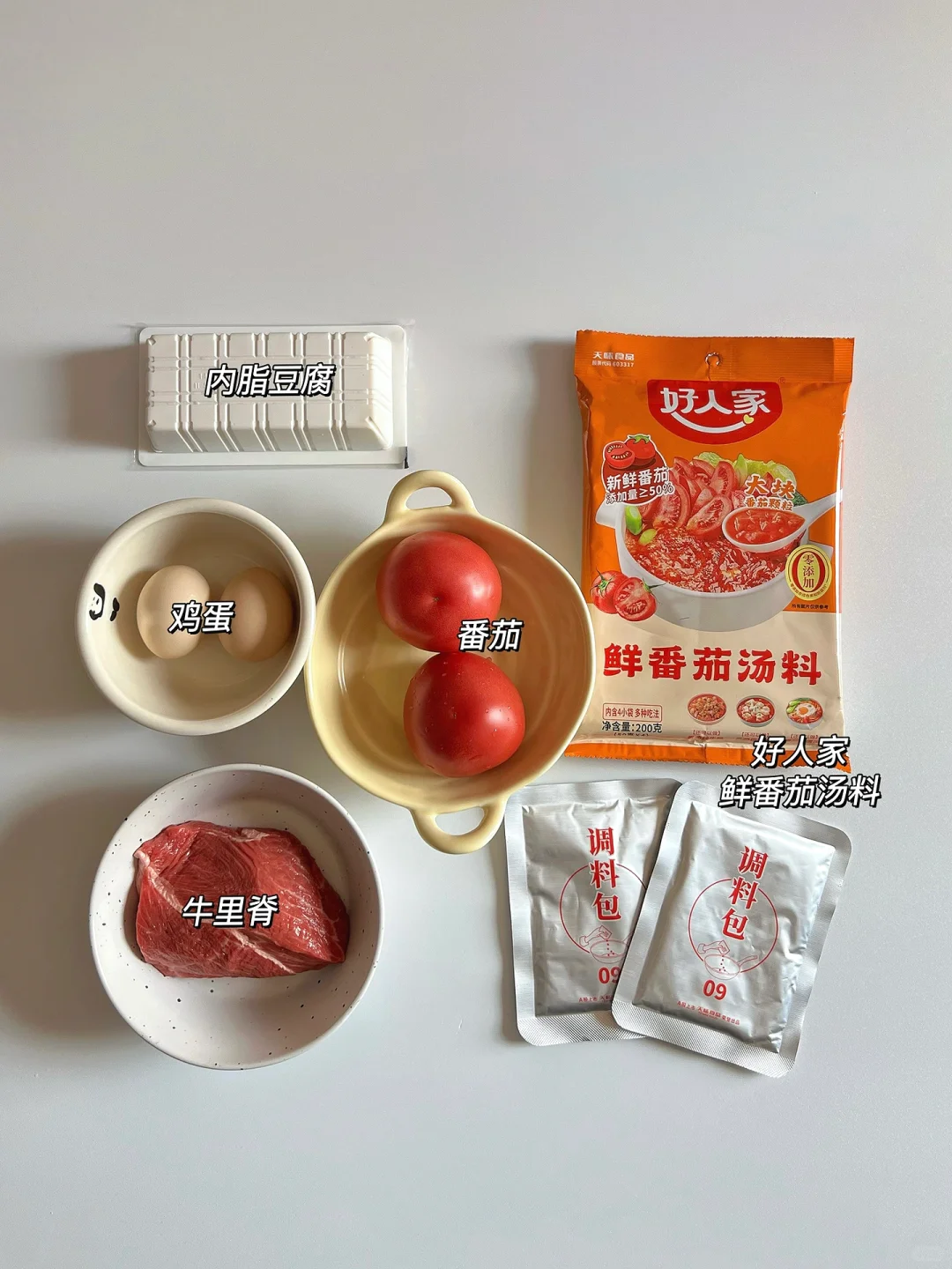 🍅 食材:番茄、瘦牛肉、内脂豆腐、鸡蛋、大蒜/小葱、好人家鲜番茄汤料