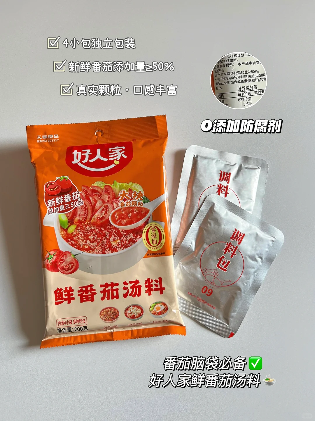 平时用调料包就怕里头加了很多防腐剂和人工色素,根本不敢下口[哭惹R] 自从发现了这个配料干净的好人家鲜番茄汤料,感觉自己再也不用苦恼了~