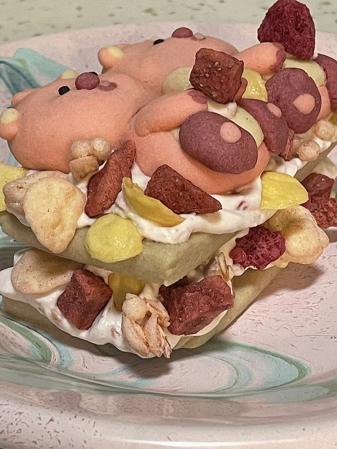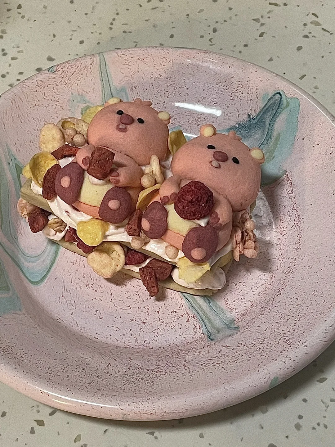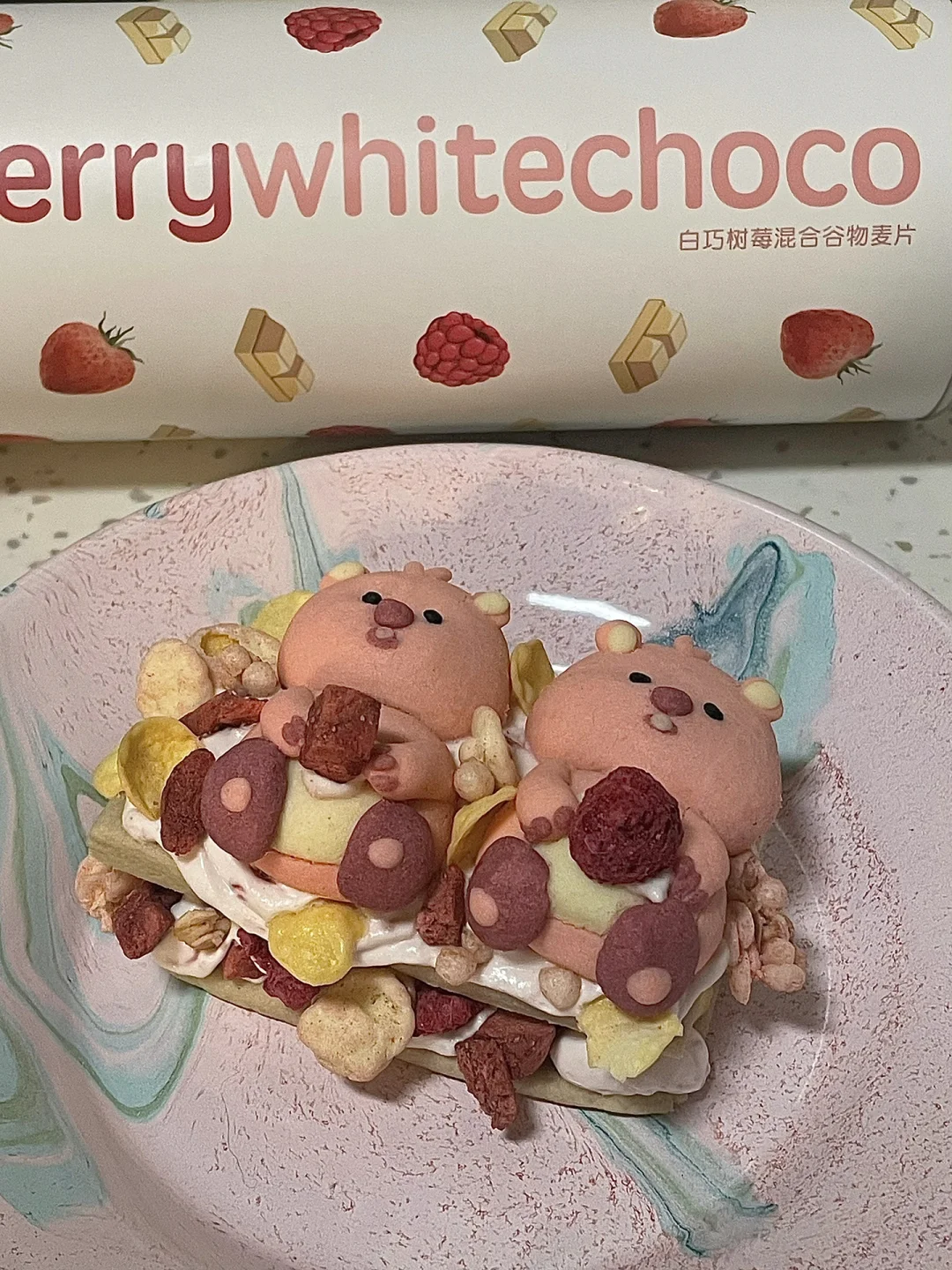 4.组装一下,一层饼干,一层树莓奶油,一层麦片,一层树莓奶油,一层饼干,一层树莓奶油,再放上loopy并放上麦片