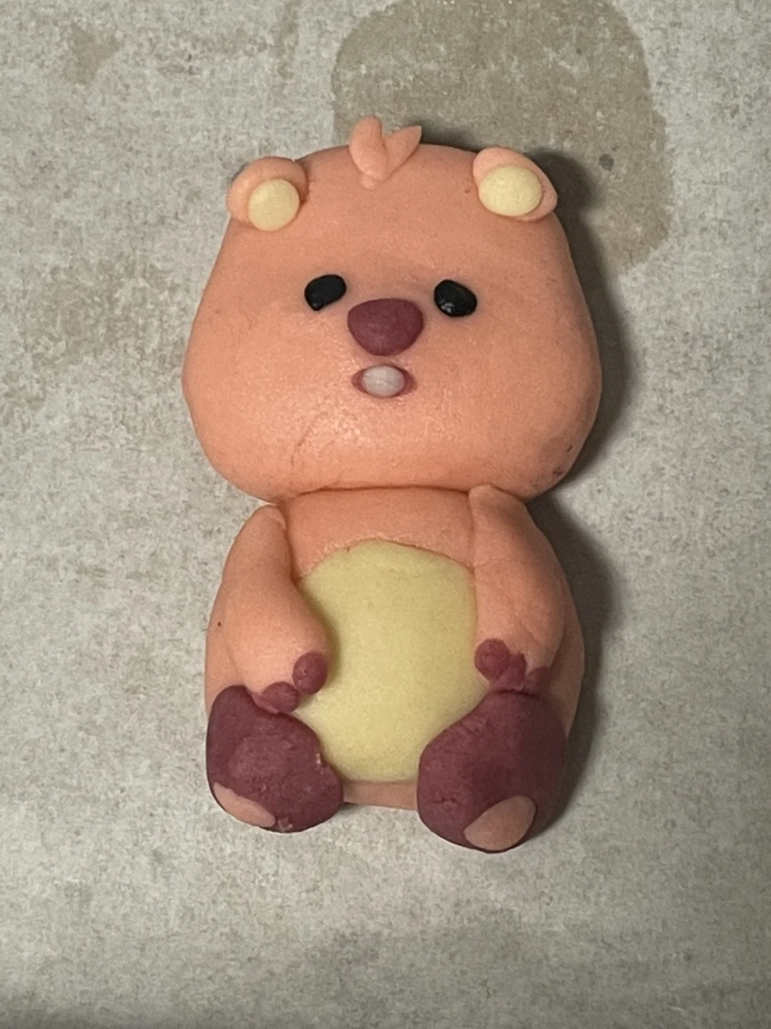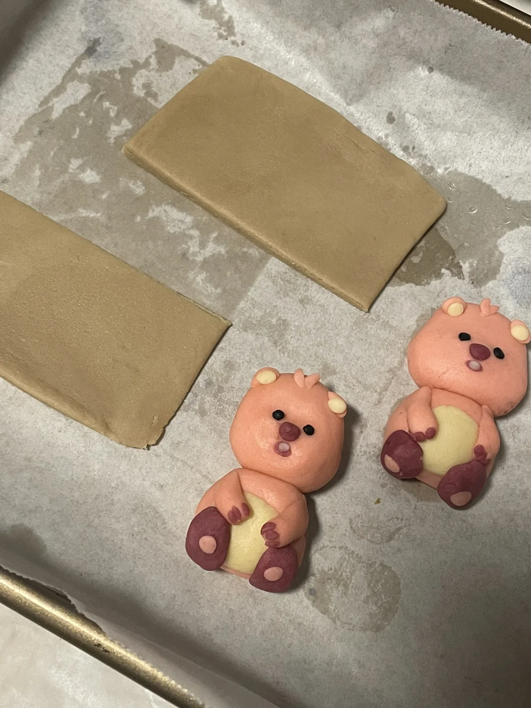 2.捏出loopy(头15g,身体10g,其他的随便捏捏),再做两个板板,150度烤18分钟(注意上色情况)