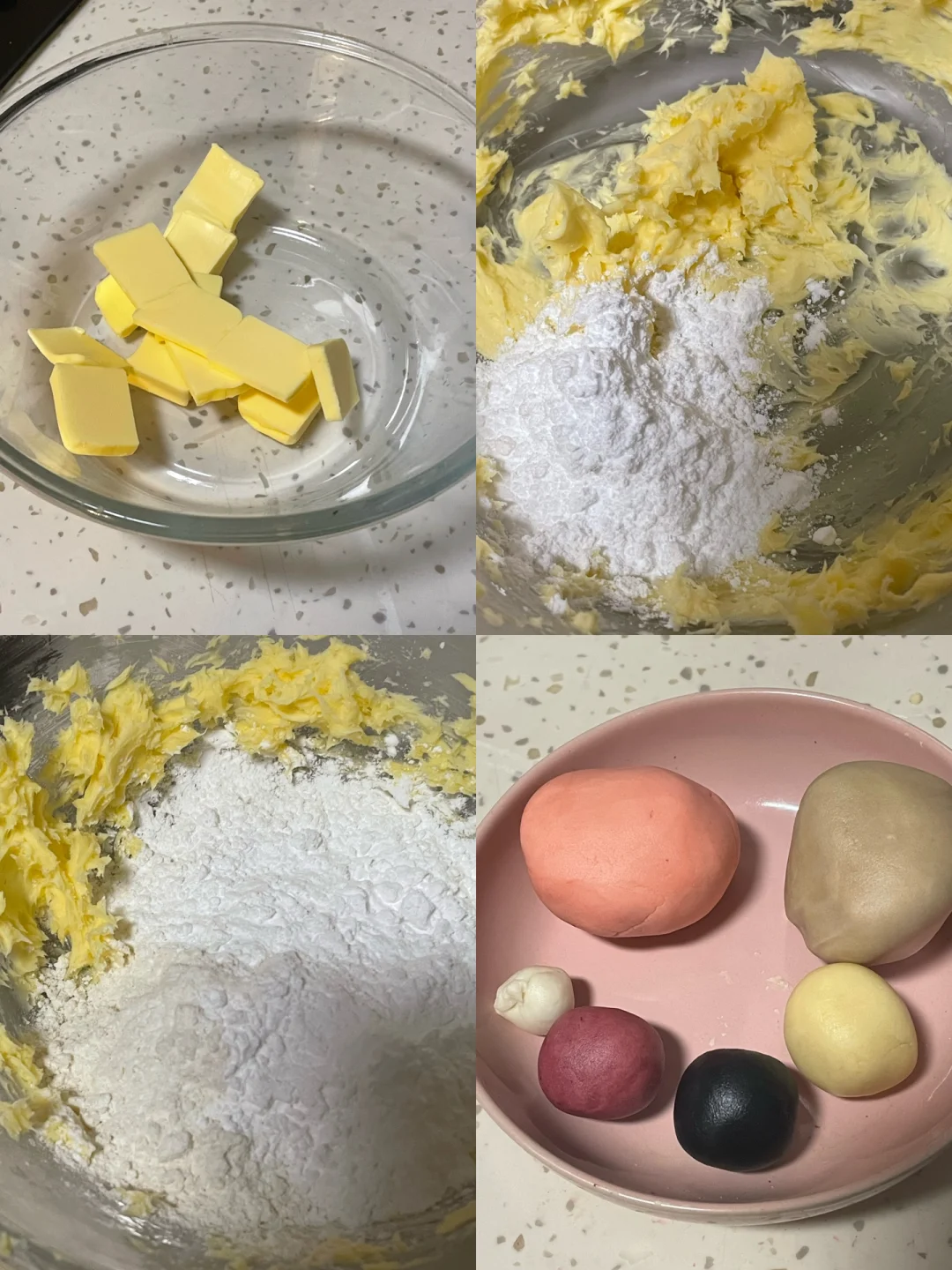 1.黄油软化加入糖粉打到发白,再加入面粉和淀粉,捏成团,并调色