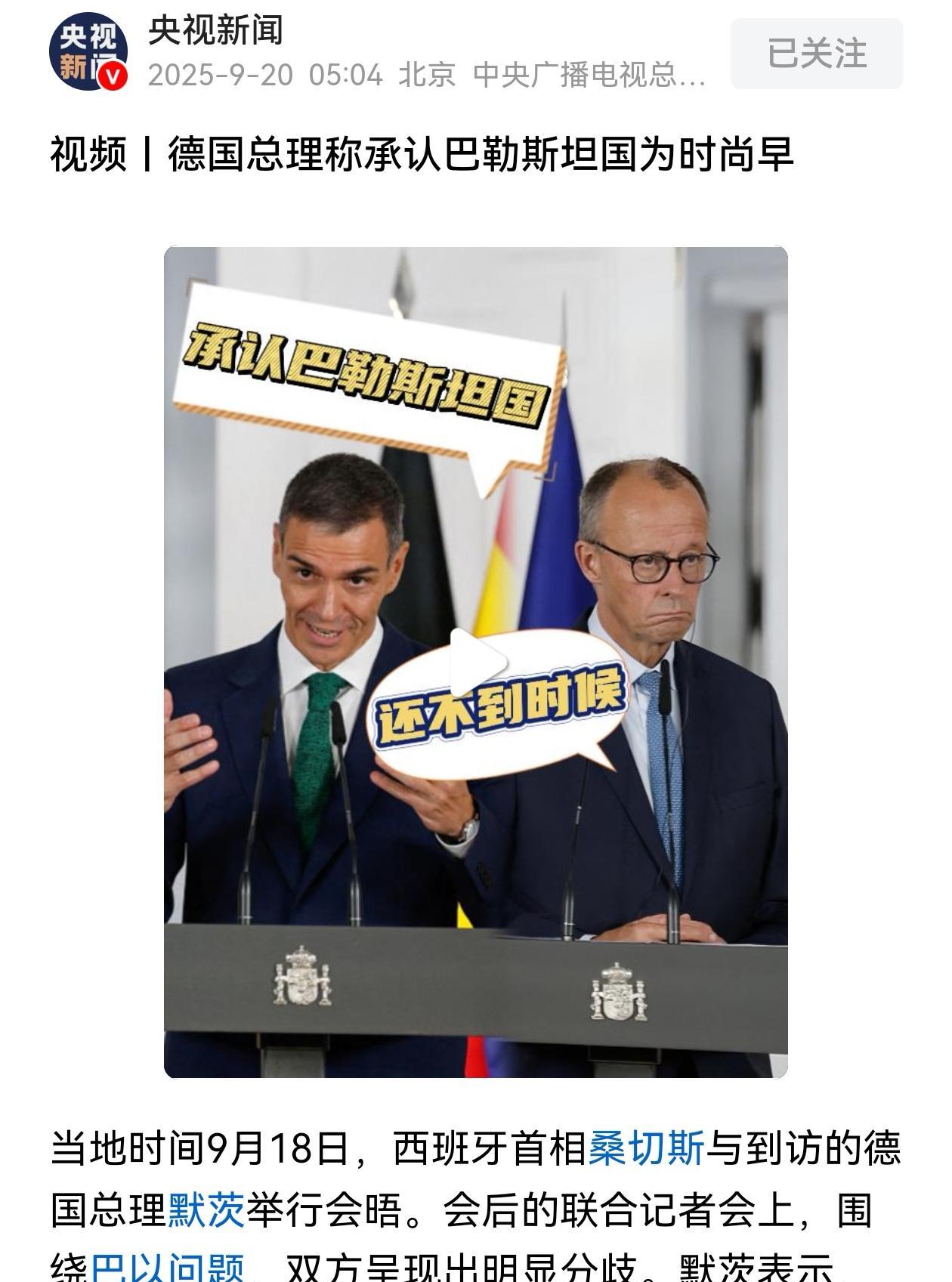 路透社昨天(9月19日)报道,日本外相岩屋毅表示,日本不打算在本月的联合国会议上承认巴勒斯坦国。报道还称,尽管受到英法两国施压,但日本外交人士透露,美国早已要求日方与美方保持一致。 西班牙首相桑切斯与到访的德国总理默茨举行的记者会上,默茨称德国政府目前不考虑承认巴勒斯坦国,对于是否制裁以色列、继续向以色列提供军援问题上,默茨表示还需要执政联盟再协商。 意大利外交人士透露,意大利政府对于是否承认巴勒斯坦国还未做出决定。