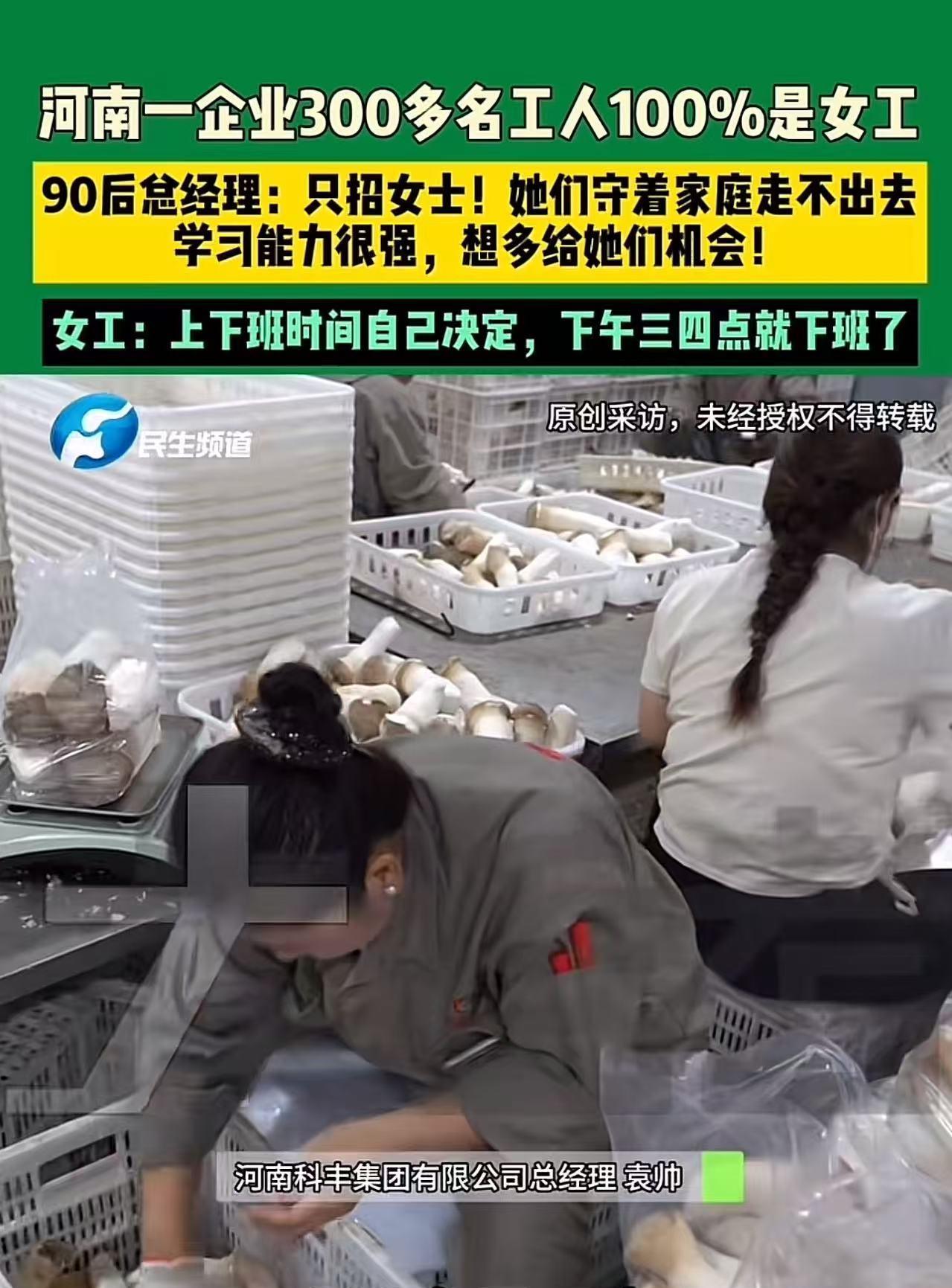 “这个90后总经理火了!”河南,一企业300多名工人,居然全部都是女工!女工:上下班时间自己决定,下午三四点就下班了!可以接受孩子,回家还能烧菜做饭!总经理:“只招女工!她们守着家庭,很难有机会走出去,我就想多为她们创造些工作机会!” (来源:河南民生频道) 在现实生活中,女性想要平衡家庭与工作,往往会面临诸多难以言说的痛点。 她们每天不仅要悉心照顾家庭的饮食起居,还要操心孩子的接送,想要出去工作,为家庭分担一些经济压力时,却发现时间上根本无法契合。 大多数公司或工作岗位,规定的下班时间都是五六点。可孩子的放学时间呢,普遍在四点多。这个时间差就像一道无法跨越的鸿沟,让她们在接送孩子和工作之间左右为难。 如果选择去工作,就没办法按时接孩子放学,孩子独自在放学路上可能会面临各种安全隐患;可要是为了接孩子放弃工作,家庭的经济重担就全压在了老公一个人身上。 但老公是赚钱的主力军,很多女人只能无奈地选择成为家庭主妇,将自己的梦想和追求暂时搁置。 可是,河南科丰集团有限公司的总经理杨袁帅,却像一束温暖的光,照亮了这些女性前行的道路。 他洞察到了女性所面临的痛处和困难,毅然决定工厂全部招聘女性职工,甚至连开叉车的司机都是女员工。 而且,工厂给予了员工极大的自主权,上班时间完全由员工自己安排。她们想下午三四点下班,只要能把每天的工作保质保量地完成就行。 让人意想不到的是,女员工人为了保住这份来之不易的工作,牟足劲干活,不仅工作效率干高,活还干的特别细致。 如今,工厂在女员工们的努力下,效益蒸蒸日上。杨袁帅总经理的这份善意,收到了意想不到的回报。 此事引发了热议,有网友说,接娃做饭上班都不耽误,很多女人真的很需要这样的工作,为这个90后经理点赞,人性化管理,好多大企业都做不到! 也有网友说,哪有这么好的工厂,最终原因就是工资低,男的不干女的还可以! 还有网友说,换个角度想想,你在家没一分钱收入,现在去上个班,一个月还有三千的收入,还有社保,可以接送孩子,多好啊! 我觉得,袁帅用实际行动诠释了什么是企业的社会责任和人文关怀,不仅为女性提供了就业平台,让她们在实现自我价值的同时兼顾家庭,更带动了整个工厂的发展。 这样的总经理,值得我们每一个人点赞和敬仰!他就像一位领航者,引领着企业和员工共同驶向更加美好的未来。