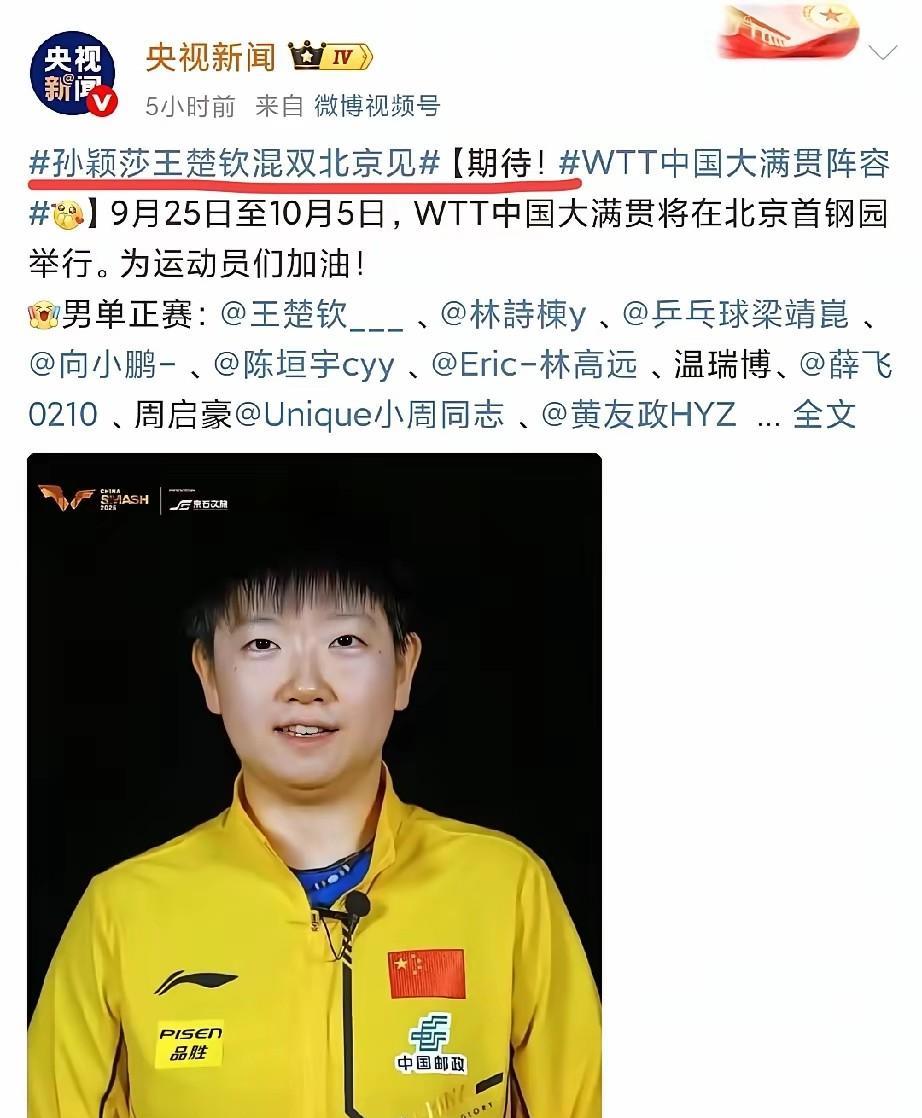 自己家孩子要打混双了! 央妈很兴奋,抓紧广而告之,给大伙分享一下! 没办法,自家孩子太优秀了! 昨天一大早央视新闻就发文,孙颖莎王楚钦混双出战。 发现了吗? 央妈这么严肃的媒体,竟然 满屏的表情符号,还是莎莎最喜欢用的那个。 央妈确实偏爱孩子,孩子喜欢什么,央妈爱屋及也喜欢什么。