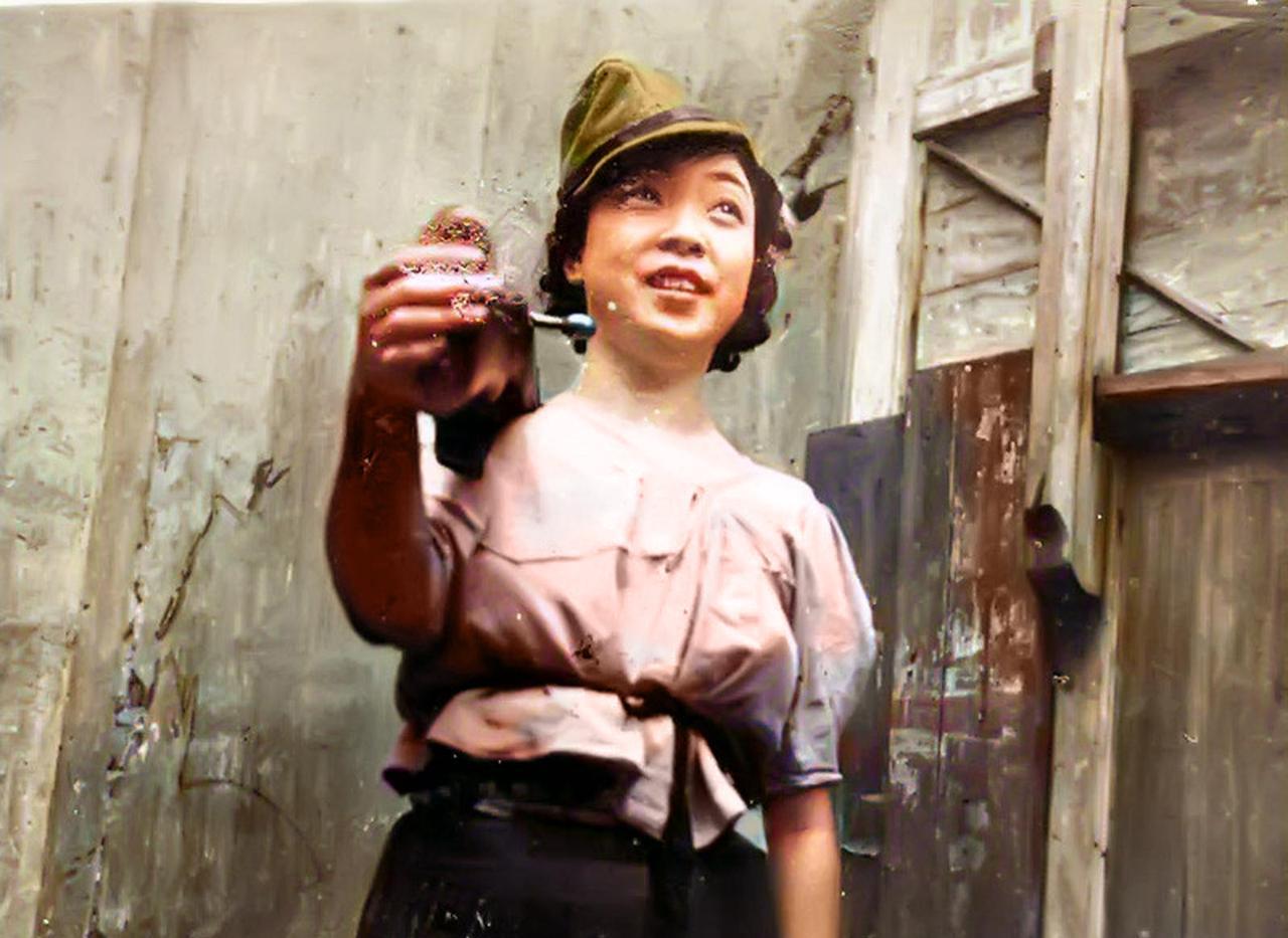 1939年,广西南宁。一个年轻漂亮的女子,头戴日军帽子,肩扛着三八步枪,面带笑容