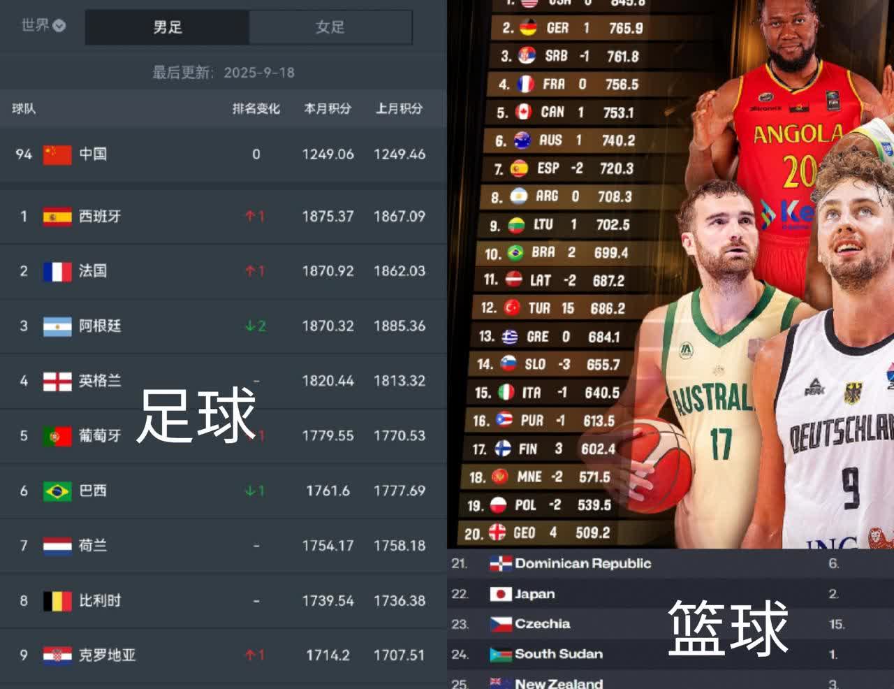 真是没有对比就没有伤害啊!国足要是能有中国男篮这个排名,我真的做梦都能笑醒。[捂脸] 虽然篮球的世界排名最低是156位,而足球的世界排名最低有200多位。 但以中国男篮目前排第27位的名次,也相当于足球世界排名起码是第42位了,这次国足的第94位强太多了。 不过有一说一,无论是中国男足还是中国男篮,这些年都是在退步。 中国男篮曾经是亚洲的霸主,现在已经一去不复返了,不要说打不过澳大利亚和新西兰了,现在连小日子和伊朗都不一定打的过。 男足就更不用多说了,这世界排名是一年比一年低。搞不好明年就要跌出前100名了。