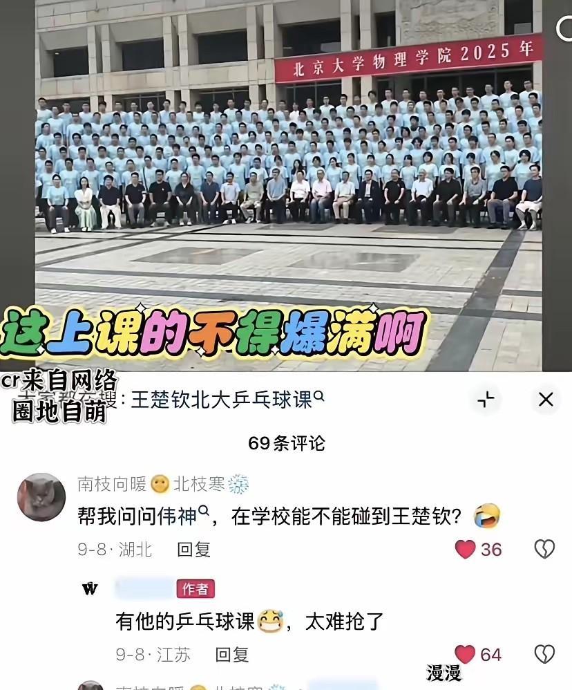 原来王楚钦不仅仅是去北大上课呀!他还要去给上课! 自从王楚钦去北大研究生报到,北大的乒乓球课,就抢不到了! 不知道这个课程系统会不会瘫痪,考验北大系统的时刻到了! 楚钦不只是北大研究生还是助教,现在抢他的课已经抢不到了! 不够优秀的人,都不配喜欢王楚钦了! 想见他,有两个机会, 第一,考上北大,成为他的同学; 第二,进入国家队成为他的同事。